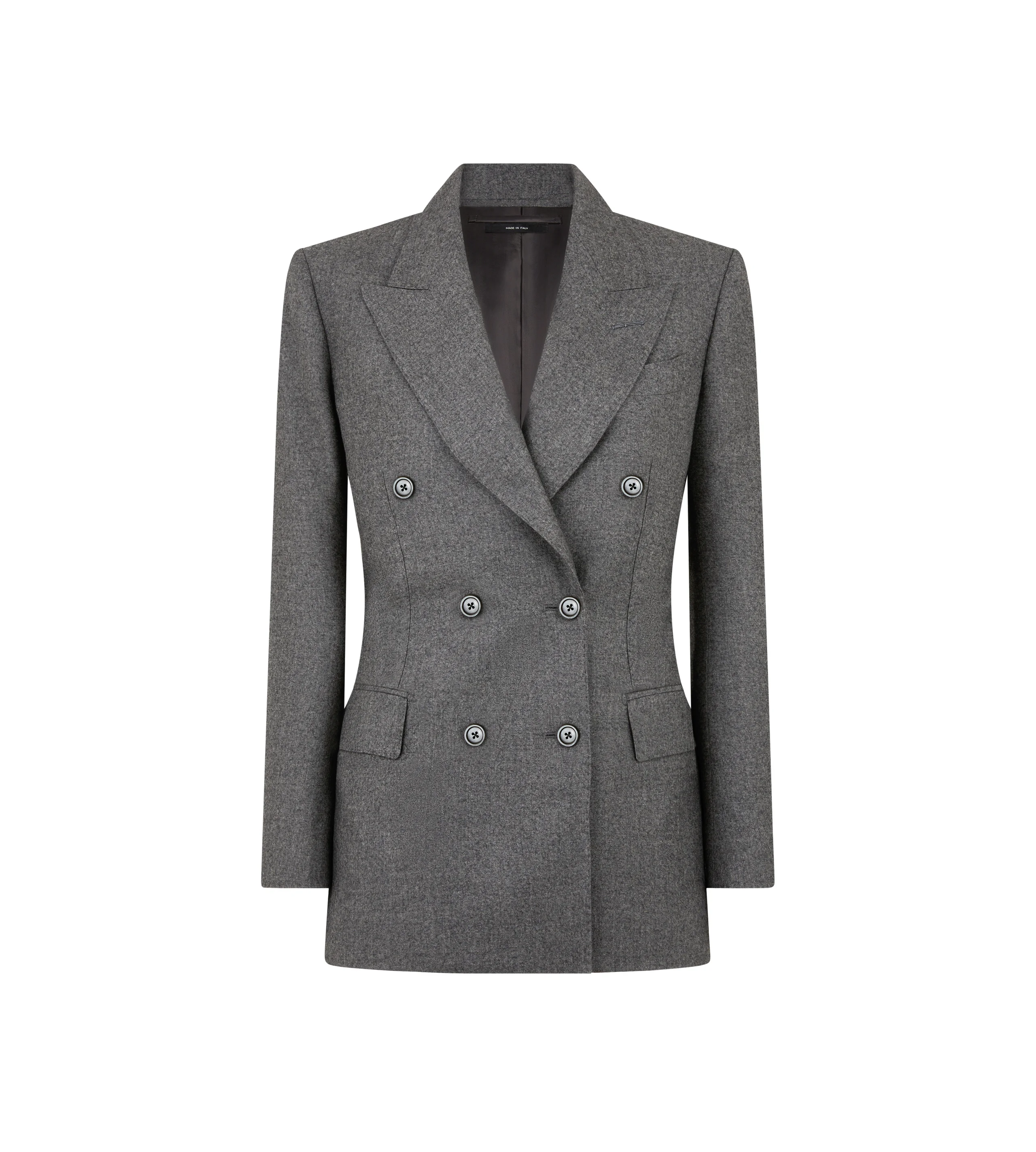 - DOUBLE BREASTED PEAK LAPEL JACKET - BARCHETTA CHEST POCKET - HAND-MADE LAPEL BUTTONHOLE - FLAP POCKETS - 5 KISSING CUFF BUTTONS - TOM FORD DESIGNS FEATURE A LONGER FIRST FINAL BUTTONHOLE ON CUFF - WITH INTERNAL POCKETS - SINGLE VENT - MOTHER OF PEARL BUTTONS - AMF STITCHING - FULLY LINED - FULLY CANVASSED - CRAFTED IN CASHMERE FLANNEL - 100% CASHMERE