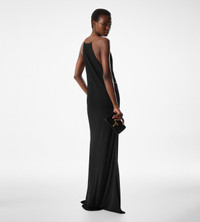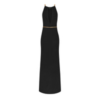- LONG SLEEVELESS EVENING DRESS - DEEP KEYHOLE DROP , - DEEP SIDE CUTS WITH CHAIN DETAILS - GOLD METAL SHOULDER STRAPS AND CHAIN BELT - HIDDEN INTERNAL BELT LOOPS ON THE BACK - FULLY LINED IN VISCOSE - CRAFTED IN SABLE JERSEY - 82% VISCOSE 18% NYLON