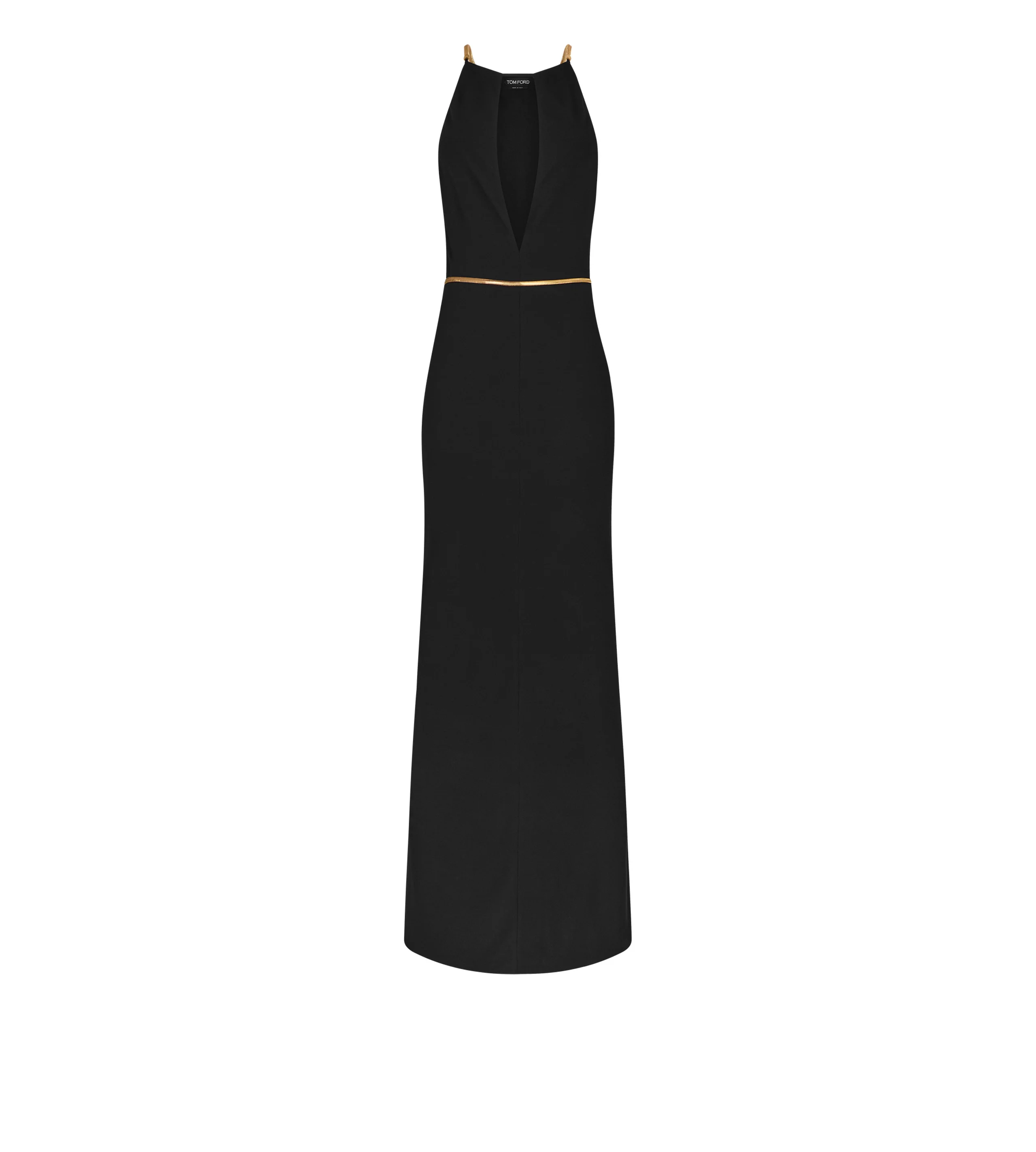 - LONG SLEEVELESS EVENING DRESS - DEEP KEYHOLE DROP - DEEP SIDE CUTS WITH CHAIN DETAILS - GOLD METAL SHOULDER STRAPS AND CHAIN BELT - HIDDEN INTERNAL BELT LOOPS ON THE BACK - FULLY LINED IN VISCOSE - CRAFTED IN SABLE JERSEY - 82% VISCOSE 18% NYLON