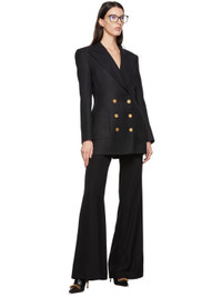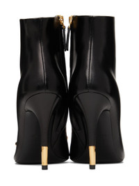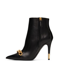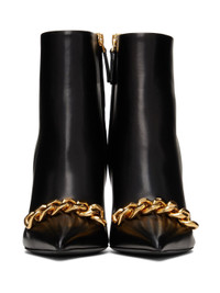 Ankle-high buffed nappa boots heels in black. Pointed toe. Curb chain hardware at vamp. Zip closure at interior. Covered stiletto heel featuring graphic hardware. Leather sole. Gold-tone hardware. Approx. 4" heel. Supplier color: Black Leather.