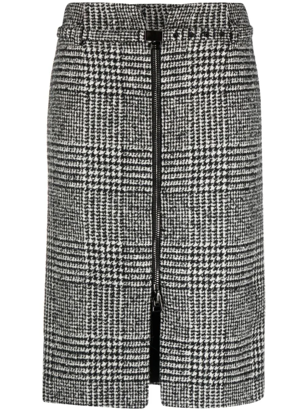 check-print pencil skirt Highlights - Grey/white - Virgin wool blend - Check print - High waist - Front slit - Belted waist - Front zip fastening - Silk lining - Straight hem Made in Italy Composition Outer: Virgin Wool 77%, Alpaca Wool 12%, Polyamide 11% Lining: Silk 100% SIZE & FIT Model measurements Height 5 ft 10 in(1.79 m) Bust/Chest 33.07 in(84 cm) Hips 35.82 in(91 cm) Waist 24.01 in(61 cm) Measurement HIPS 37.79 in(96 cm) LENGTH 24.4 in(62 cm) WAIST 31.49 in(80 cm) FittingInformation This midi-length skirt is intended to be worn high on the waist The belt offers adjustability for fitted preferences Made from a midweight non-stretch fabric This piece fits true to size – take your usual size Washing instructions Dry Clean Only
