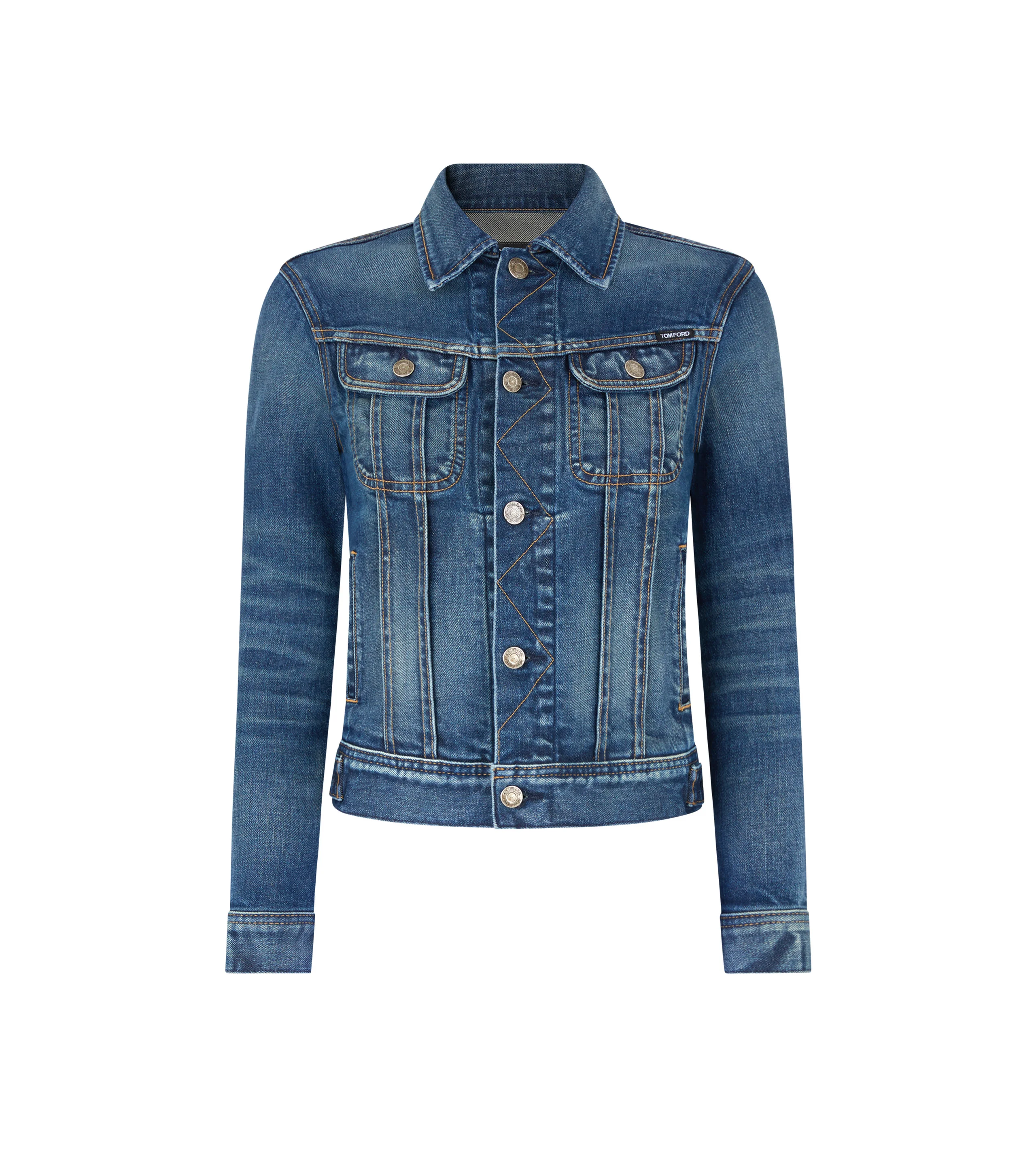 - DENIM JACKET - PATCH FLAP CHEST POCKETS - SIDE POCKETS - BUTTONED CUFFS - TOM FORD SIGNATURE TUCK BUTTONS ALONG FRONT OPENING, POCKETS, CUFFS AND SIDE ADJUSTERS - TOM FORD EMBOSSED ALCANTARA LABEL ON THE BACK - ANTIQUE SILVER HARDWARE - CRAFTED IN COMFORT STONE WASHED DENIM - 98% COTTON 2% POLYURETHANE - MADE IN USA