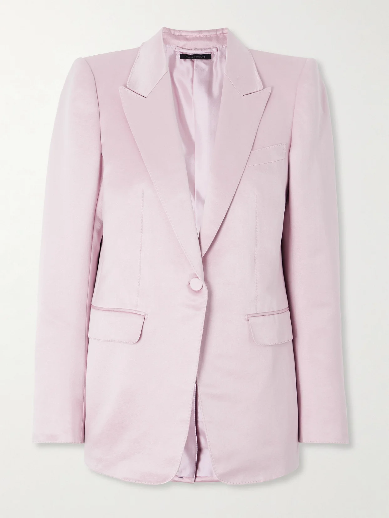 TOM FORD's baby-pink blazer was contrasted with an acid-green blouse on the label's Fall '25 runway. Tailored from cotton and silk-blend duchesse-satin, it has a single-breasted front with peak lapels and fastens with a single covered button. Wear yours as a suit with the matching pants in our edit.