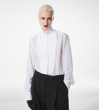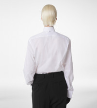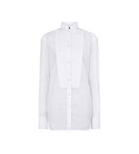 PRODUCT NO: CA3326-FAX1572 A light white cotton voile shirt features a structured plastron front lined in self fabric, paired with a formal wing tip collar and piquet bibs. The covered piquet buttons run along the plastron and barrel cuffs, with TOM FORD's touch of mother of pearl details at the final front closures. The back yoke and internal elastic inside the cuffs allow for comfortable movements without sacrificing elegance and style. Composition: 100% cotton, Mother of Pearl buttons Made in Italy