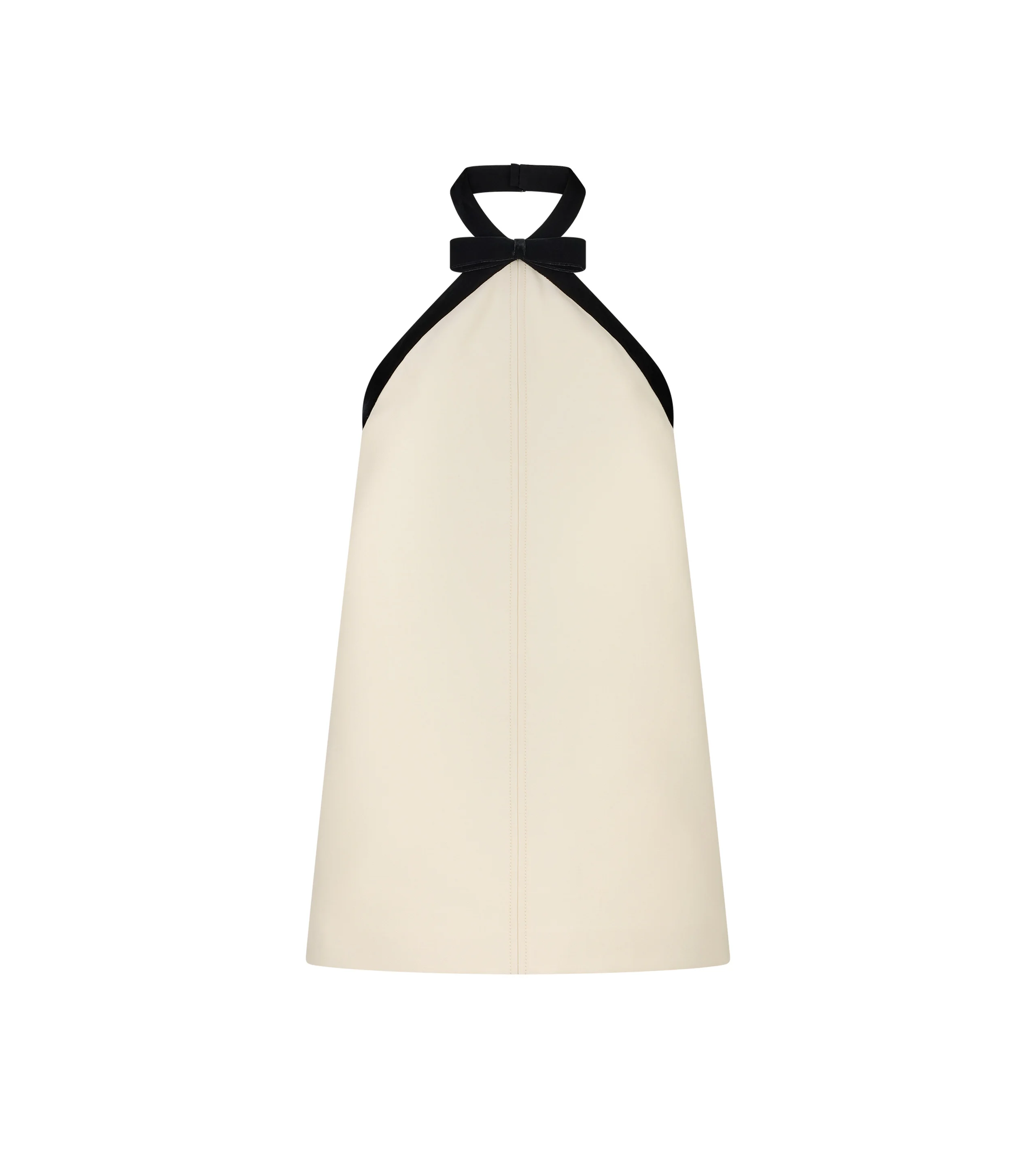 - A-LINE MINI COCKTAIL DRESS - BOW DETAIL ON COLLAR - VELVET FINISH ON TOP HEM AND NECKLINE - CENTRE BACK INVISIBLE ZIP CLOSURE - FULLY LINED - INTERNAL LEATHER CONSTRUCTION WITHIN THE BOW FOR REINFORCEMENT - CRAFTED IN WOOL AND SILK CREPE COUTURE - 75% WOOL 25% SILK