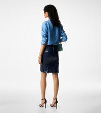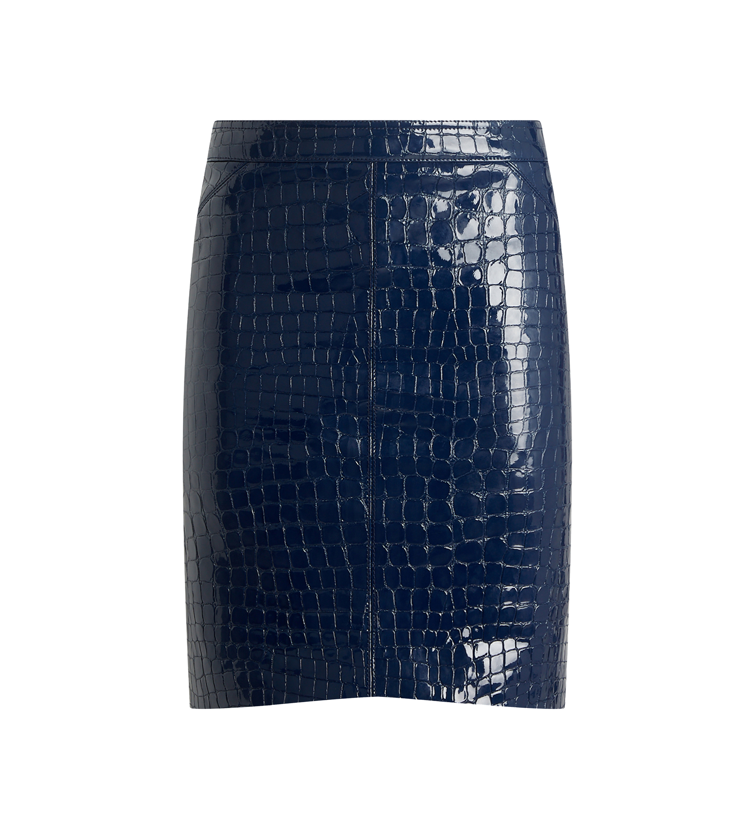 - ABOVE THE KNEE SKIRT - FRONT SLANTED POCKETS - PLEATED BACK HEM - CENTRE BACK ZIP - FULLY LINED - CRAFTED IN GLOSSY CROCO EMBOSSED GOAT LEATHER - 100% GOAT LEATHER