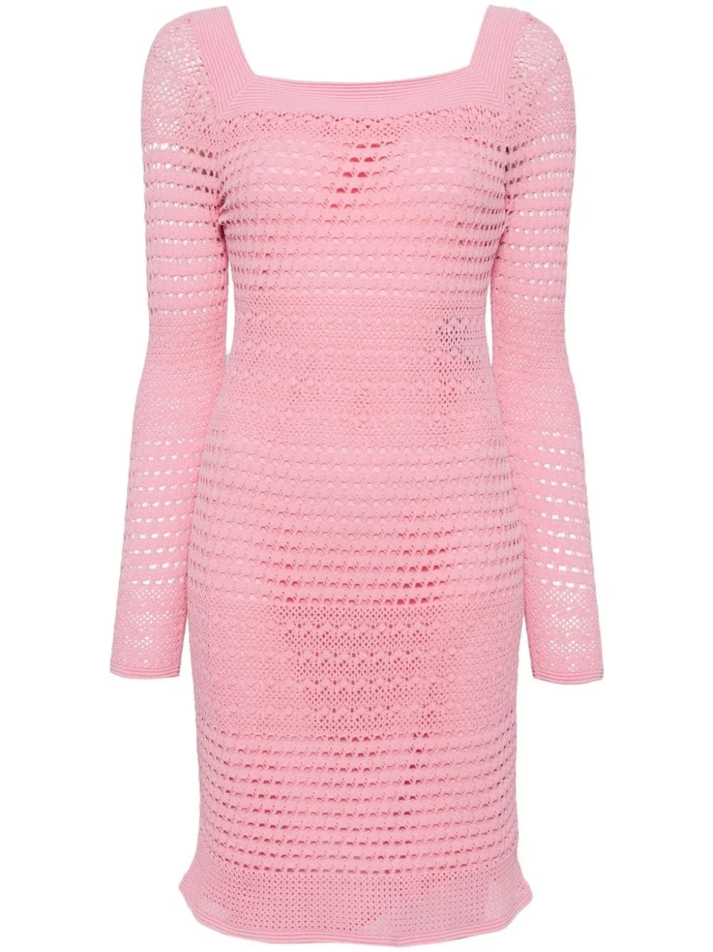 open-knit square-neck minidress Highlights - Flamingo pink - Stretch-design - Open knit - Ribbed trim - Square neck - Long sleeves - Thigh-length - Straight hem - Detachable slip dress Made in Italy Composition Outer: Viscose 70%, Polyester 24%, Polyamide 6% Body: Viscose 70%, Polyester 24%, Polyamide 6%