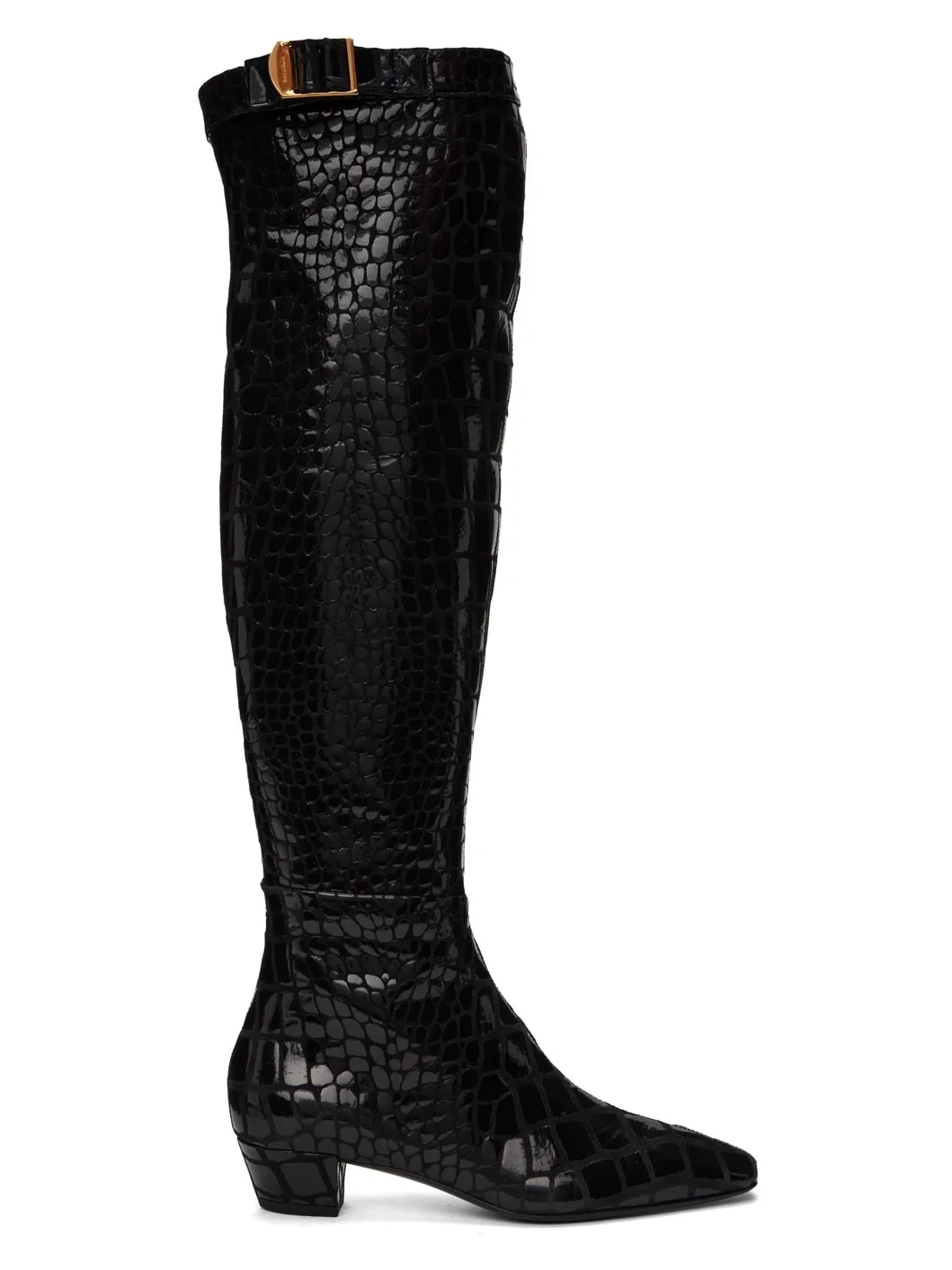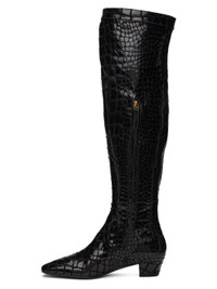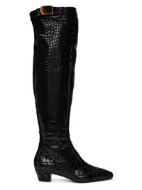Knee-high goatskin suede boots in black. Croc pattern printed throughout. · Square toe · Cinch strap at collar · Zip closure at inner side · Grained leather lining in black · Covered block heel with rubber injection · Leather sole · Logo-engraved gold-tone hardware · Heel: H1.5 in Supplier color: Black