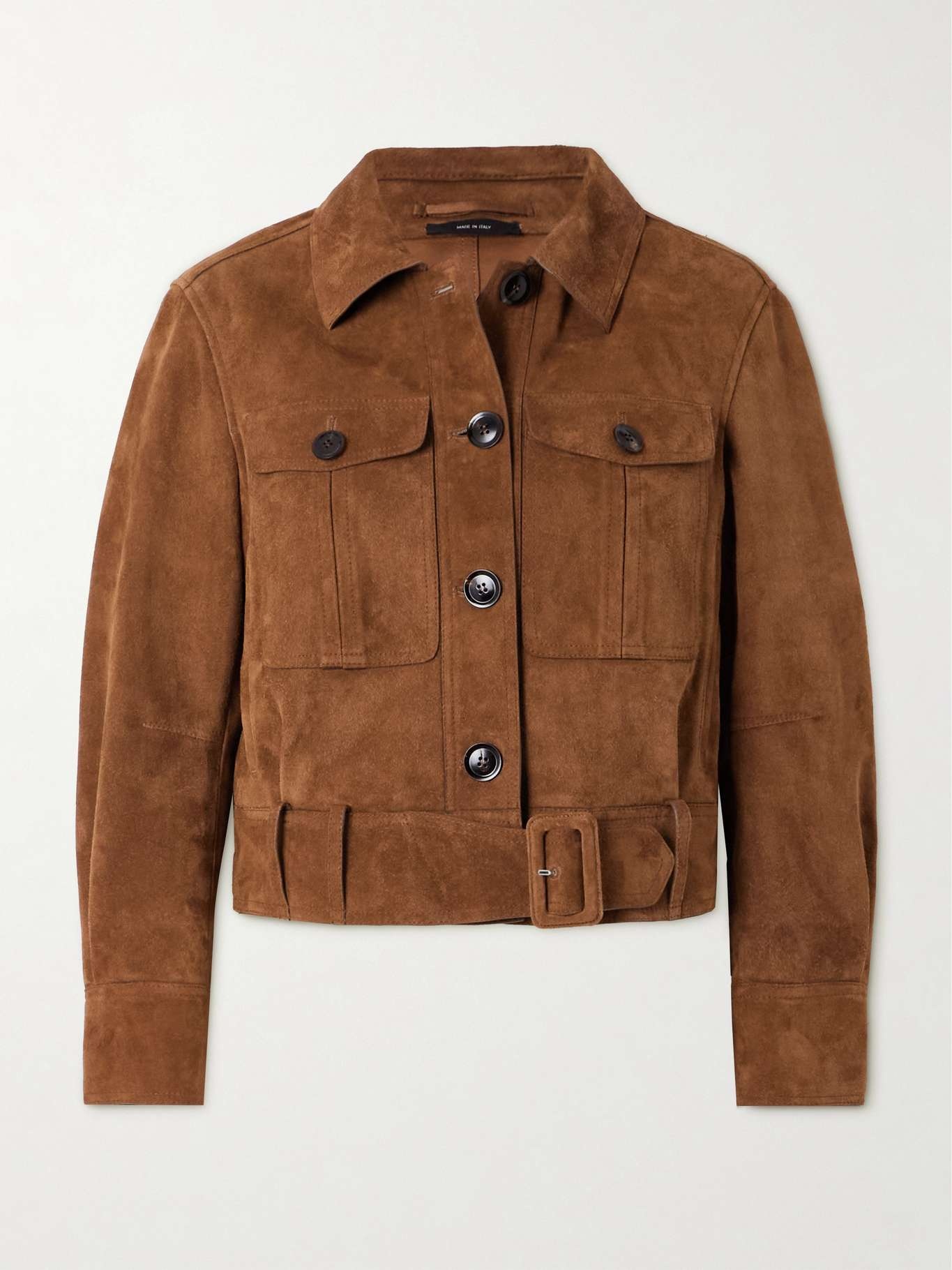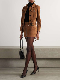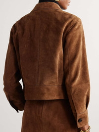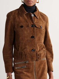 EDITORS'NOTES Countless hours of technical expertise and fabric know-how inform all of TOM FORD's wardrobe classics. This jacket is cut from plush suede for a slightly cropped, boxy profile enhanced with a belted waist. Team yours with the coordinating skirt in our edit for maximum impact. SIZE & FIT Model measurements: - Fits true to size, take your normal size - Designed for a slightly loose fit - Cropped length - Mid-weight, slightly stretchy suede - Model is 180cm/ 5'11" and is wearing an IT 40 - Bust: 77cm/ 30.5” - Waist: 60cm/ 23.5” - Hip: 92cm/ 36” DETAILS & CARE - Brown suede - Button fastenings through front - 100% suede (Calf); buttons: 100% horn (Buffalo) - Specialist clean