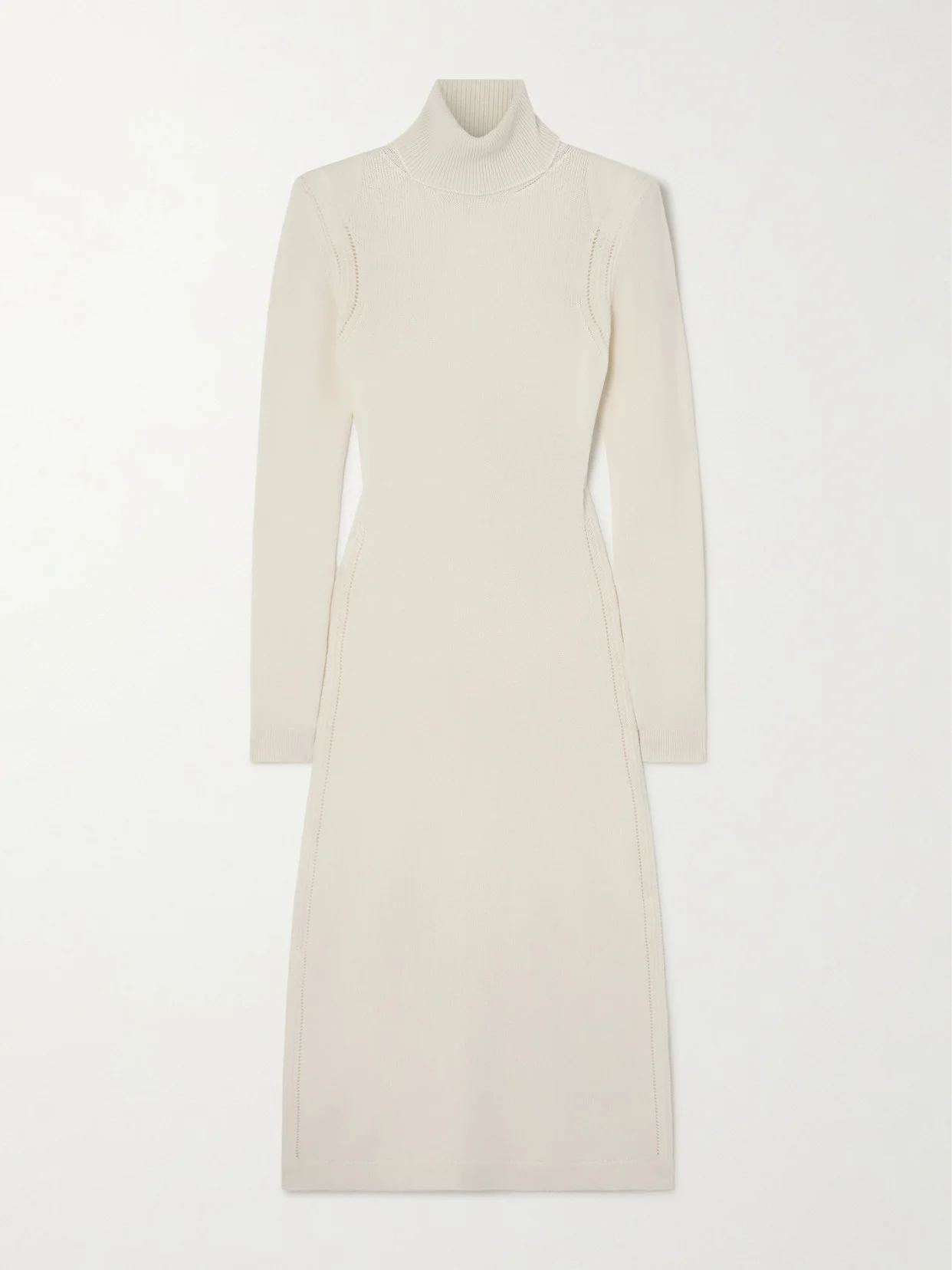 TOM FORD's midi dress turns to reveal a sizable V-shaped cutout below the turtleneck. It's made from soft cashmere that closely hugs your figure and has subtly textured detailing along the side seams. The shoulder pads add structure to create a beautiful shape.