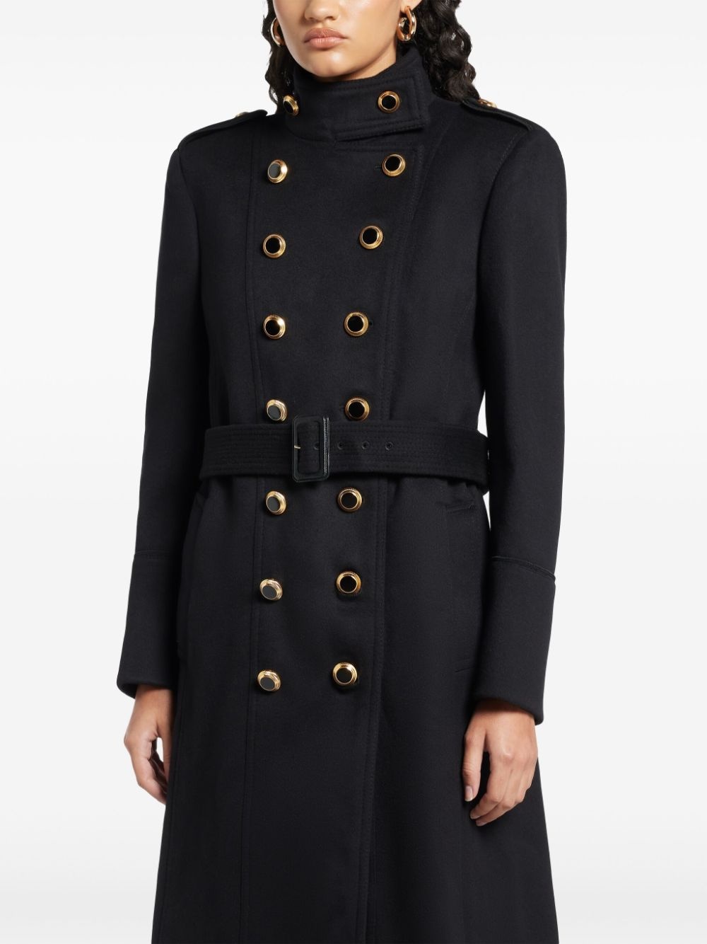 double-breasted long coat Highlights - Black - Virgin wool-cashmere blend - Mock neck - Double-breasted button fastening - Epaulettes - Long sleeves - Buttoned cuffs - Belted waist - Two side slit pockets - American rear vent - Full lining - Straight hem Imported Composition Outer: Calf Leather 100%, Buffalo Horn 100%, Virgin Wool 95%, Cashmere 5% Lining: Cotton 56%, Viscose 44%