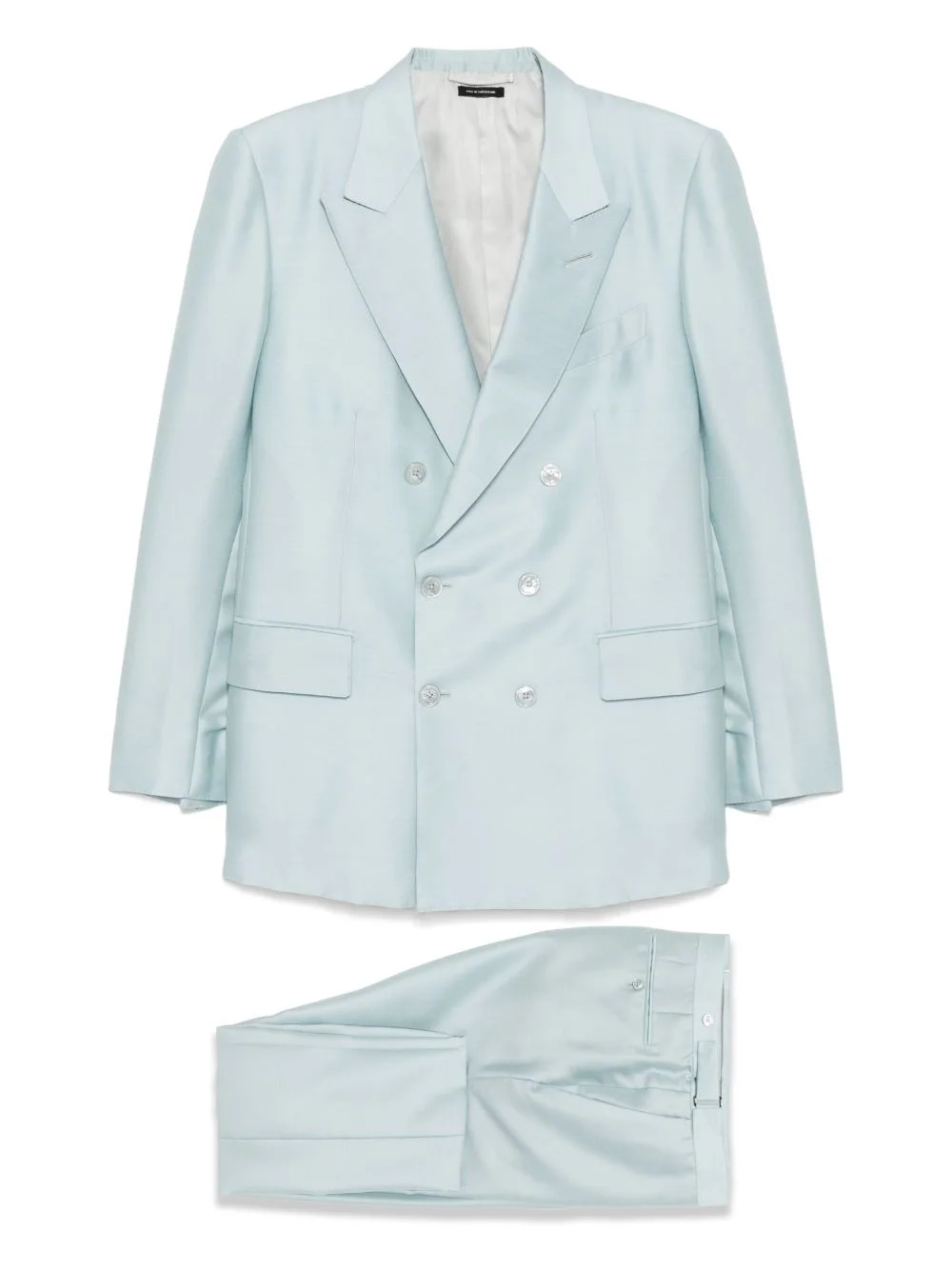double-breasted suit Highlights - Light blue - Double-breasted button fastening - Two front flap pockets - Concealed front button, hook and zip fastening - Two side inset pockets Made in Italy Composition Lining: Cupro 100% Outer: Wool 50%, Mohair 40%, Silk 10%