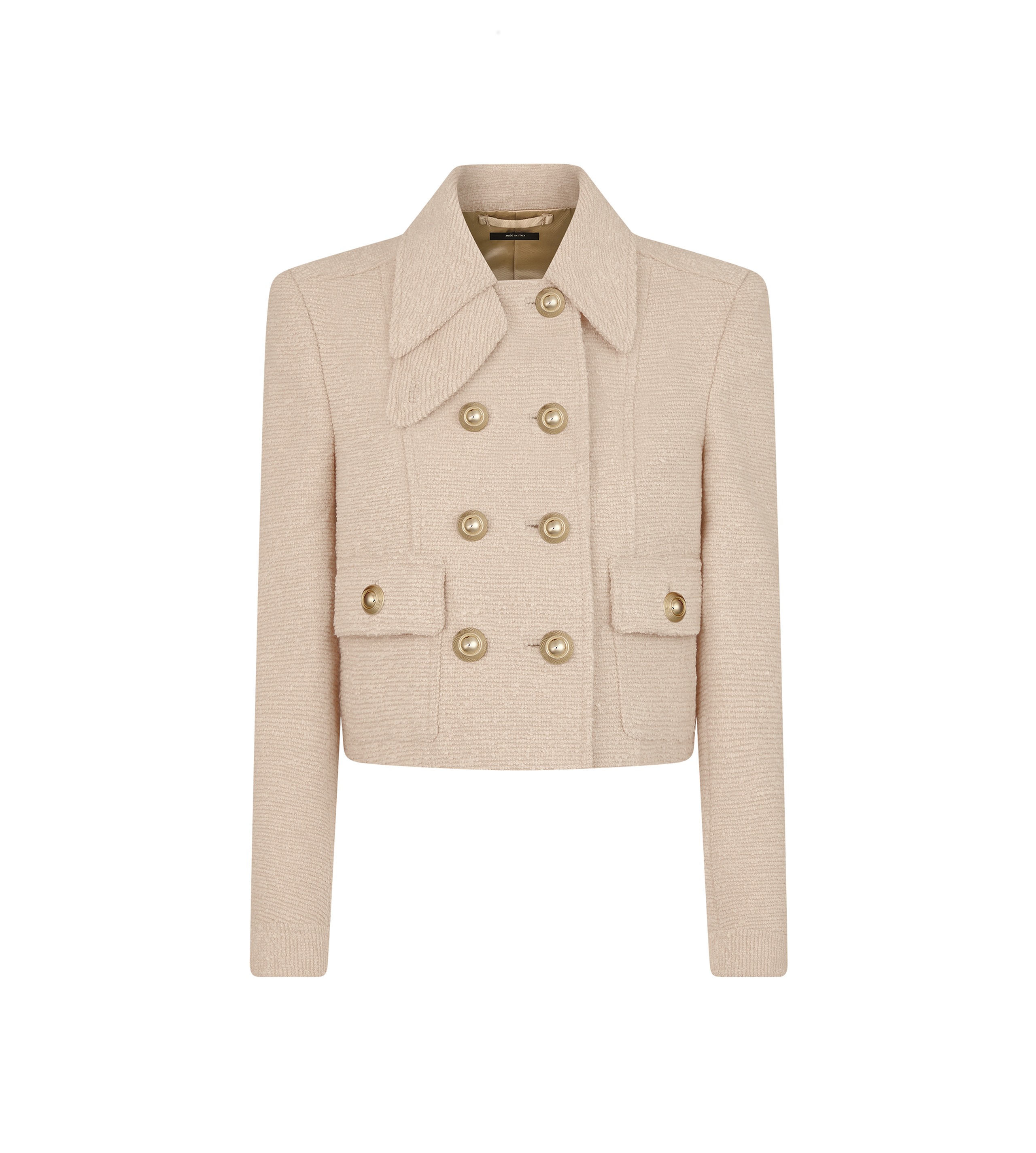 - DOUBLE BREASTED CHASSEUR JACKET - THROAT LATCH - PATCH POCKETS - CENTRE BACK MARTINGALE - LIGHT GOLD AND AMBER VINTAGE GOLD BUTTONS ALONG FRONT THROAT LATCH, FRONT OPENING, POCKETS, CUFFS AND MARTINGALE - TOM FORD SIGNATURE LEATHER GRAB HANDLE DETAIL - FULLY LINED - CRAFTED IN VIRGIN WOOL BOUCLE' - 73% VIRGIN WOOL 10% NYLON 8% SILK 7% CASHMERE 2% ELASTANE