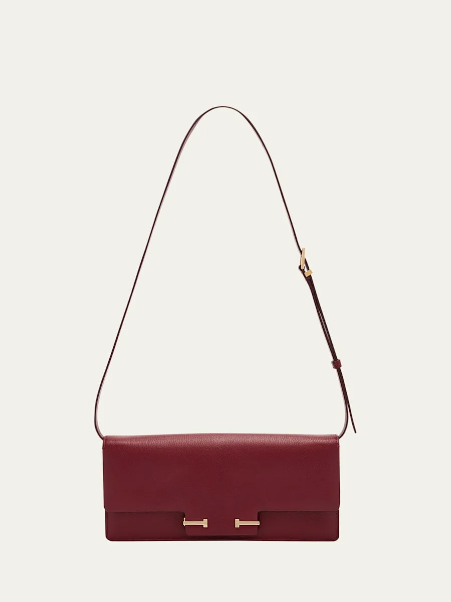 The TOM FORD East-West shoulder bag from the Aube line is crafted in supple grain leather and highlighted with a gold-tone signature double T clasp. Adjustable, detachable shoulder strap Flap top Clasp closure Interior, one flat pocket, one card slot, one pull-out mirror Authenticity card Protective dust bag Leather Made in Italy Online Inquiries: BGS21_V6NCN| Store Inquiries: #5070669