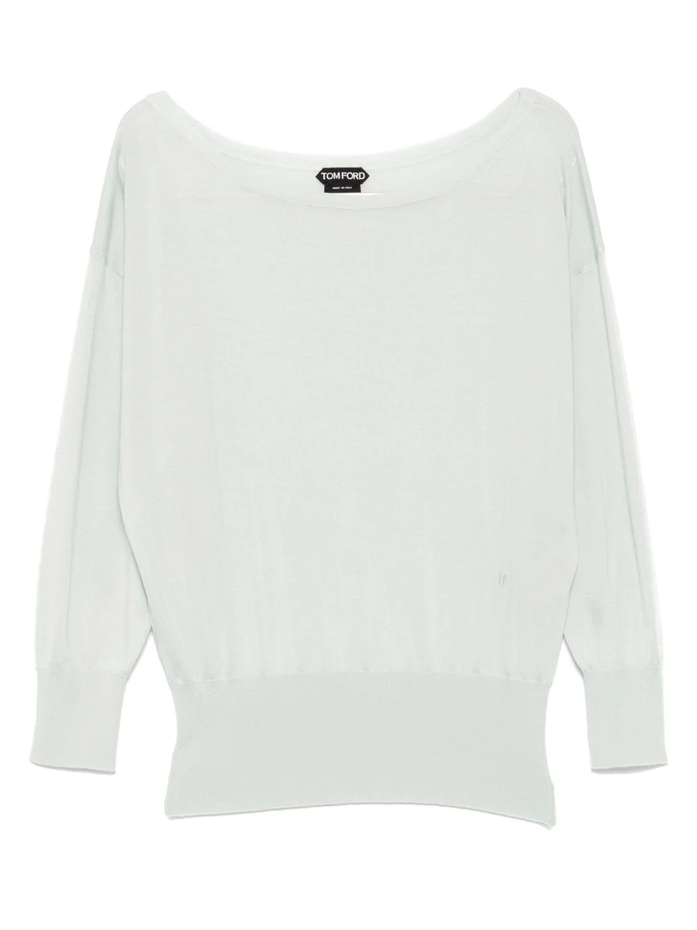 embroidered-logo boat-neck top Highlights - Mint green - Boat neck - Ribbed cuffs and hem Made in Italy Composition Cashmere 70%, Silk 30% SIZE & FIT Model measurements Height 5 ft 10 in(1.78 m) Bust/Chest 29.92 in(76 cm) Hips 34.64 in(88 cm) Waist 24.8 in(63 cm) FittingInformation Designed to be unstructured, offering a loose fit throughout Made with a lightweight knit, this piece offers some stretch