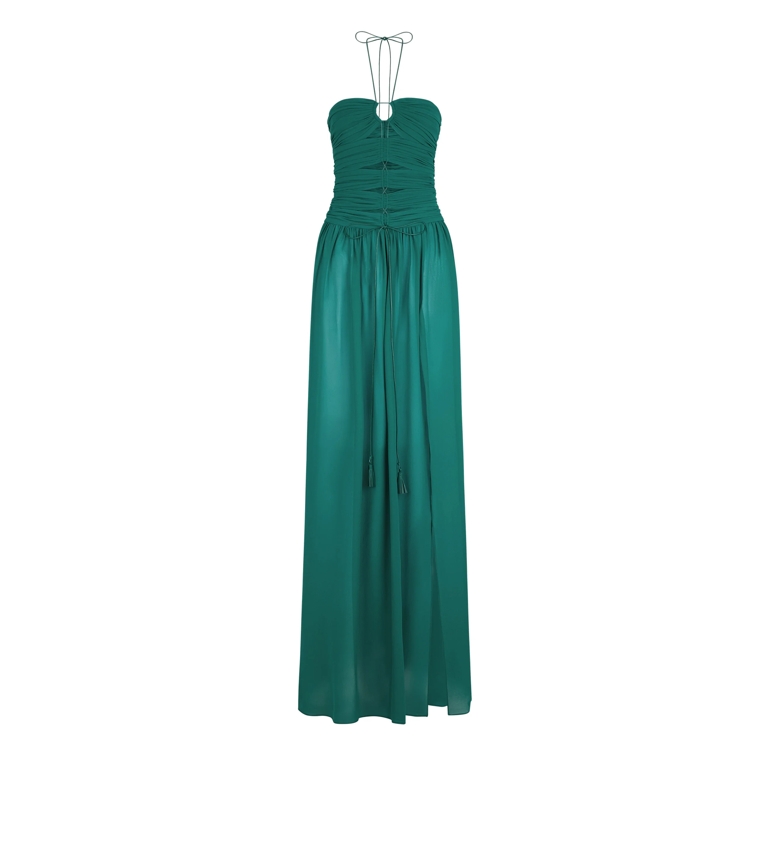 - LONG SLEEVELESS EVENING DRESS WITH CUT OUT DETAILS - LEATHER DRAWSTRINGS WITH TASSEL DETAIL ALONG NECKLINE AND CENTRE FRONT - CENTRE BACK INVISIBLE ZIP - LINED SKIRT IN ITS OWN FABRIC - CRAFTED IN SILK GEORGETTE - 100% SILK