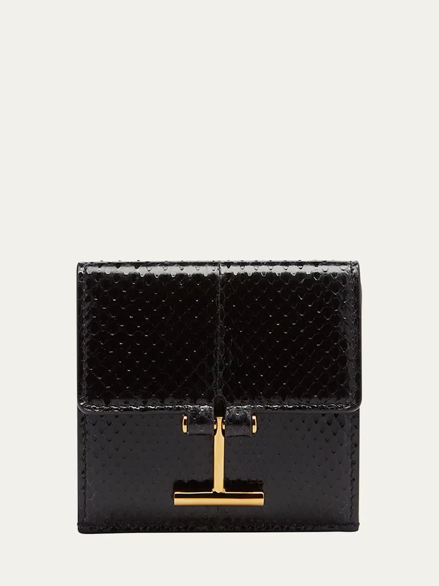 TOM FORD card holder in shiny snake-embossed leather Flap top with T bar snap closure Exterior, four card slots Approx. 3.7"H x 3.7"W Made in Italy Online Inquiries: BGS21_D553U| Store Inquiries: #4973483