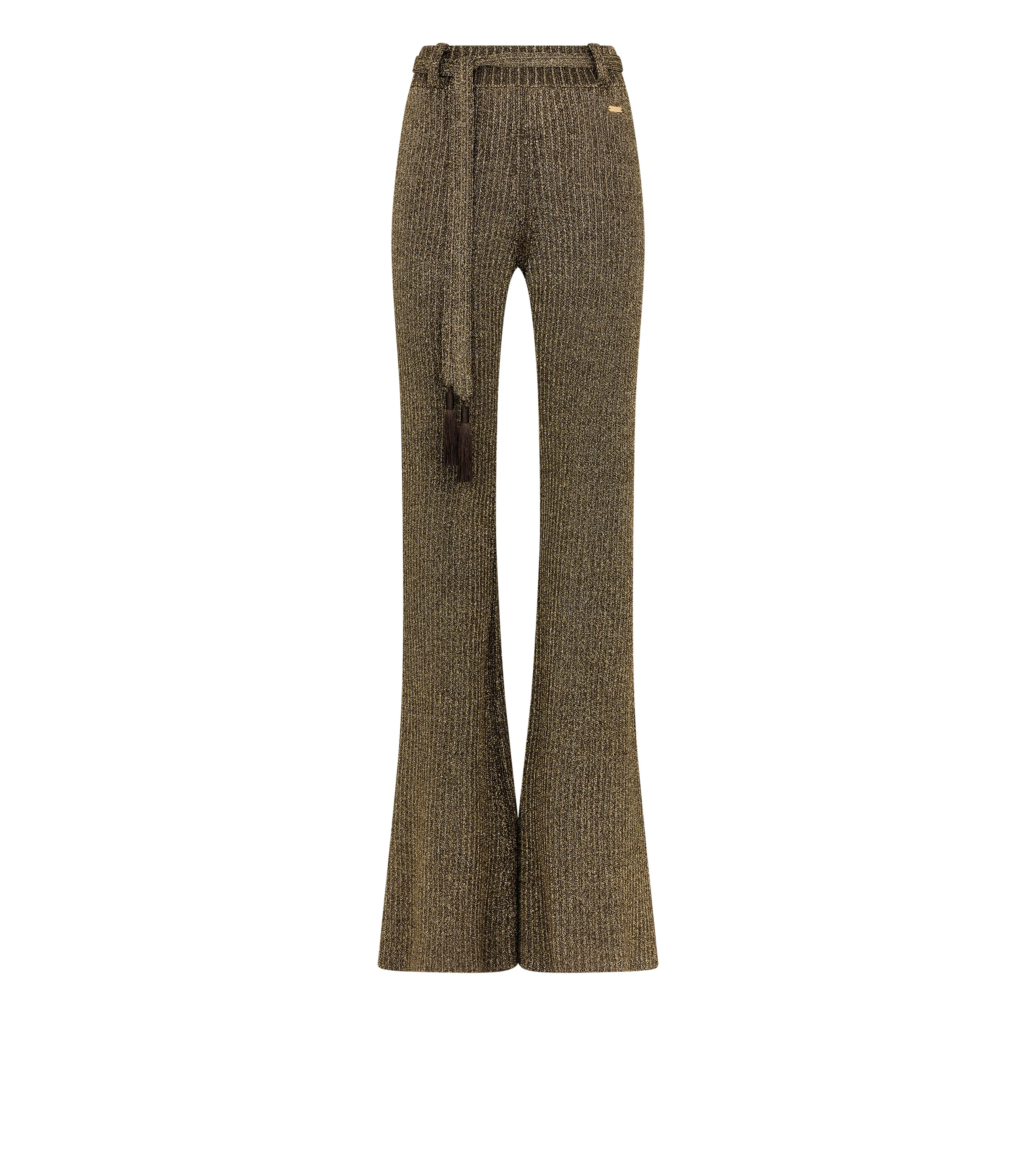 - KNITTED FLARED PANTS - ELASTICATED WAISTBAND - BELT LOOPS - TOM FORD LOGO METAL PLAQUE - SELF BELT WITH TASSELS - CRAFTED IN VANISE' VISCOSE LUREX RIB - 14 GAUGE - 67% VISCOSE 15% PM 16% POLYAMIDE 2% POLYURETHANE - MADE IN ITALY