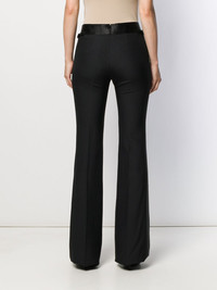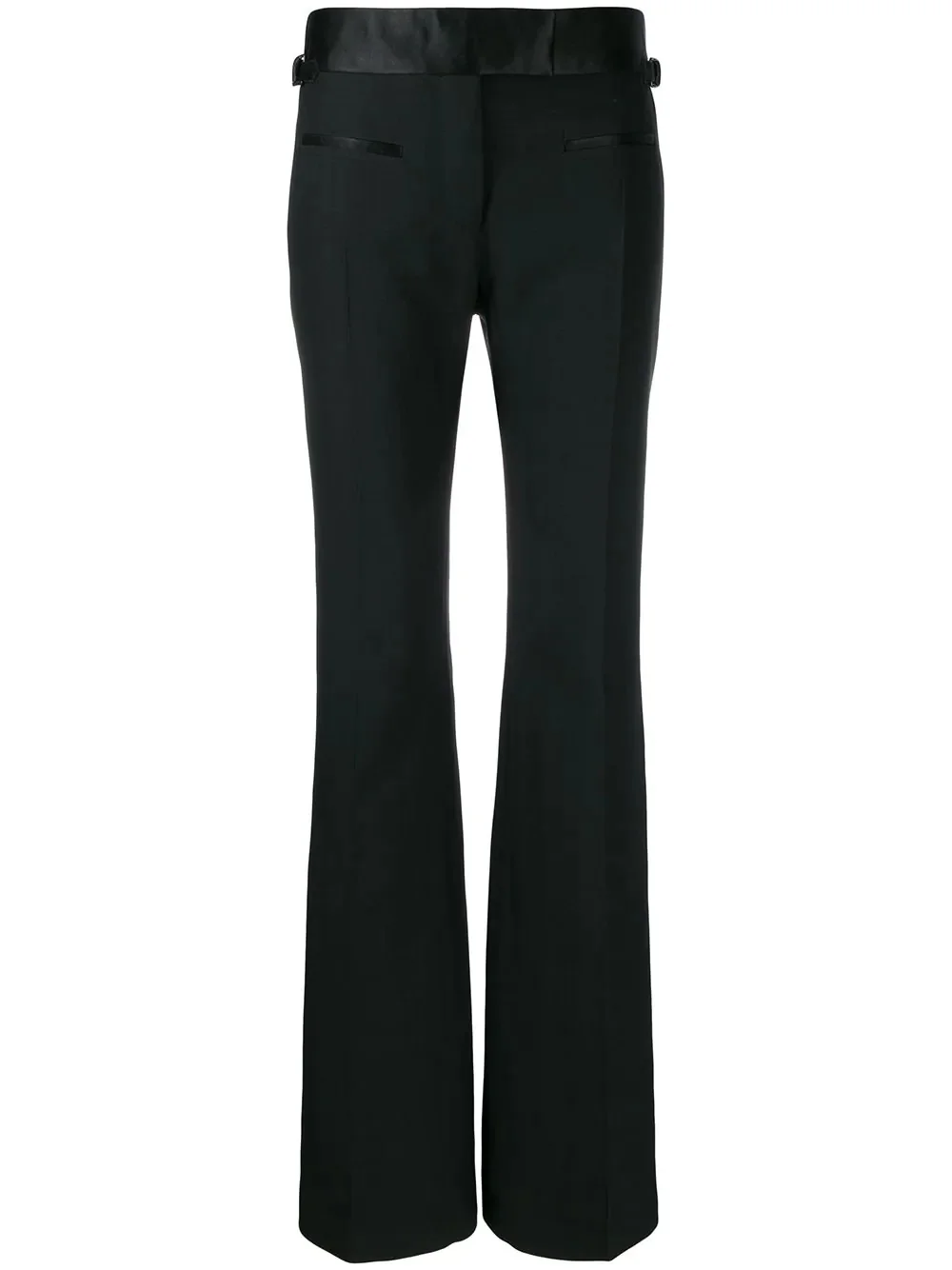 flared tailored trousers Back wool and silk blend flared tailored trousers from TOM FORD featuring a concealed fastening, front pockets, buckle details and a flared style. Made in Italy Composition Outer: Wool 83%, Silk 17% Lining: Silk 90%, Cotton 70%, Viscose 20%, Spandex/Elastane 10%, Modal 10% SIZE & FIT Model measurements Height 5 ft 10 in(1.77 m) Bust/Chest 35.03 in(89 cm) Hips 35.03 in(89 cm) Waist 23.62 in(60 cm) FittingInformation This piece fits true to size. We recommend you get your regular size Designed to be fitted at the waist and through the thigh, loose from the knee Made with a mid-weight stretch fabric Washing instructions Dry Clean Only