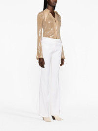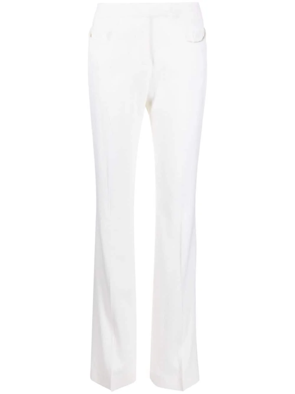 flared vrgin-wool trousers Tom Ford's take on tailoring is inspired by ‘70s styles, as shown by these Barathea-wool trousers. They’re cut to sit high on the waist and fit slim through the leg before flaring out at the knees. Pressed creases and rounded western front pockets play on smart and casual codes. Highlights - Chalk white - Virgin wool - Mid-rise - Concealed front fastening - Belt loops - Rounded pocket to the side - Two rear welt pockets - Flared Made in Italy Composition Lining: Viscose 54%, Polyester 46% Outer: Virgin Wool 100% SIZE & FIT Model measurements Height 5 ft 11 in(1.8 m) Bust/Chest 34.25 in(87 cm) Hips 35.82 in(91 cm) Waist 24.8 in(63 cm) FittingInformation Designed with a flared hem, these trousers allow for a close fit at the waist with a slim fit over the leg and widening towards the hem Made from a midweight non-stretch fabric This piece fits true to size – take your usual size Washing instructions Dry Clean Only