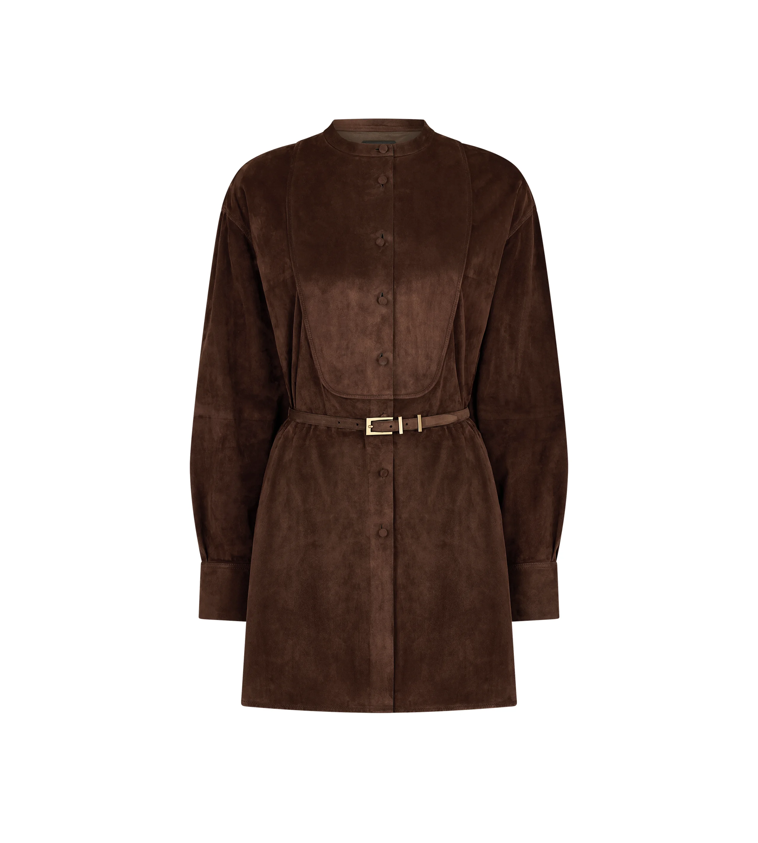 FULL GRAIN LAMB SUEDE BELTED PLASTRON MINI SHIRT DRESS