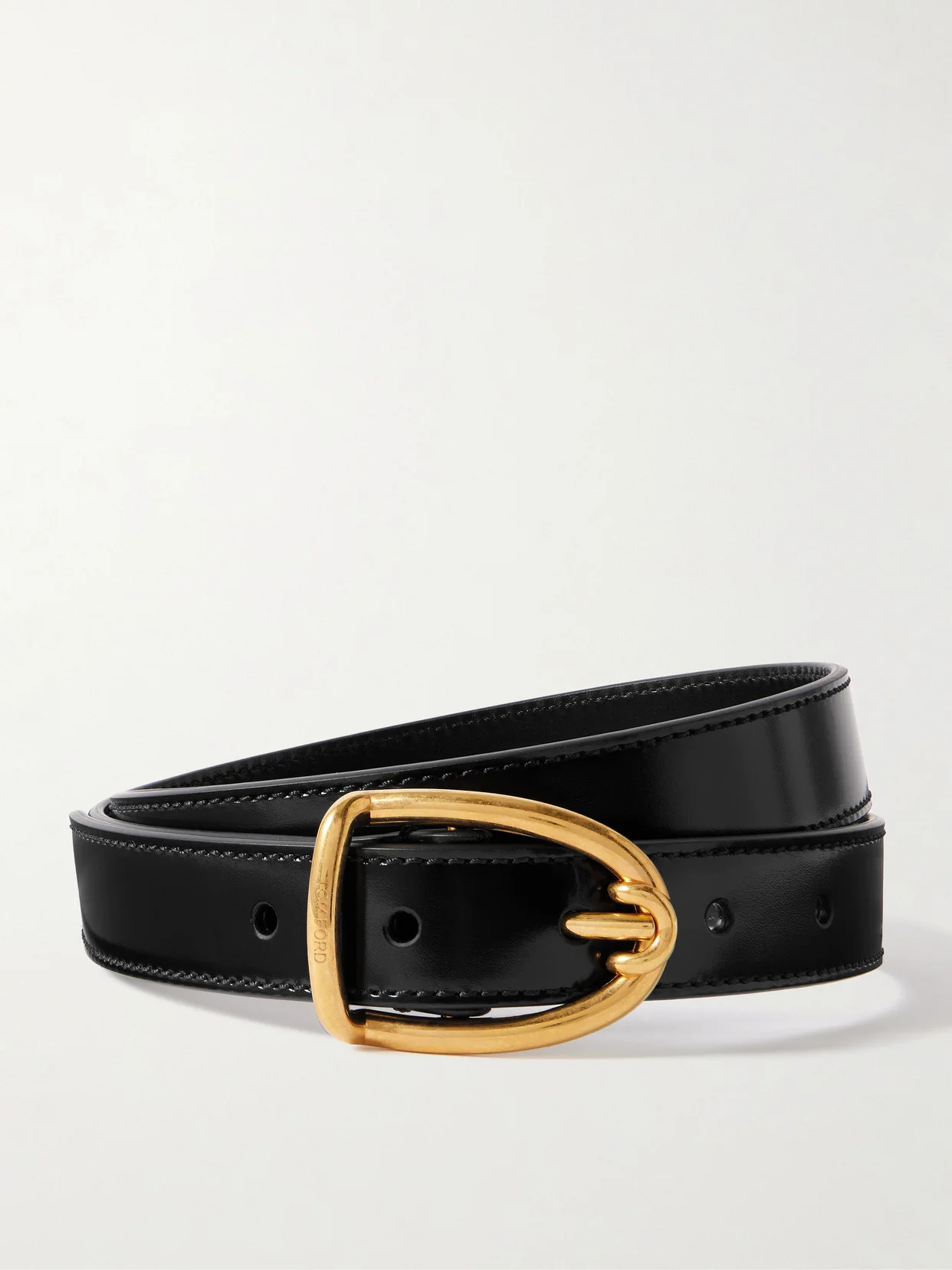 The slender shape of TOM FORD's belt means it slips easily through the loops of your favorite pants and looks so elegant cinching thick winter coats. It's crafted from supple glossed-leather and centered by a sleek D-shaped gold-tone buckle.