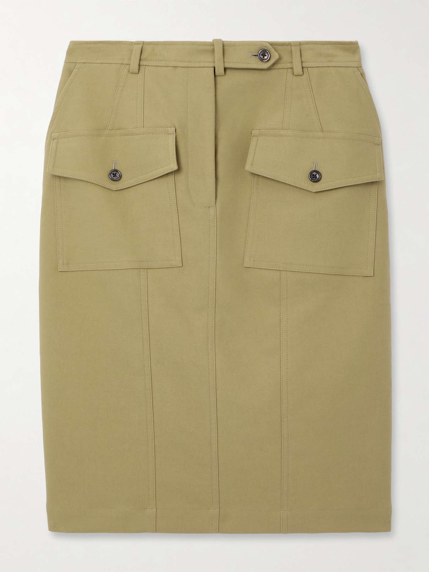 EDITORS'NOTES TOM FORD's skirt has generous cargo pockets that give it a cool, utilitarian feel. It's made from cotton-blend twill and traced with streamlining seams. Large to size. See Size & Fit notes. SIZE & FIT Model measurements: - Fits large to size, take one size smaller than normal - Knee-length, designed to be worn at the hip - Mid-weight, non-stretchy fabric - Model is 177cm/ 5'10" , normally wears an IT 38 and is wearing an IT 36 - Bust: 79cm/ 31" - Waist: 61cm/ 24" - Hip: 89cm/ 35" DETAILS & CARE - Army-green cotton-blend twill - Button and concealed zip fastening at front - 97% cotton, 3% elastane; buttons: 100% horn (Buffalo) - Dry clean - Mother-of-pearl: Australia