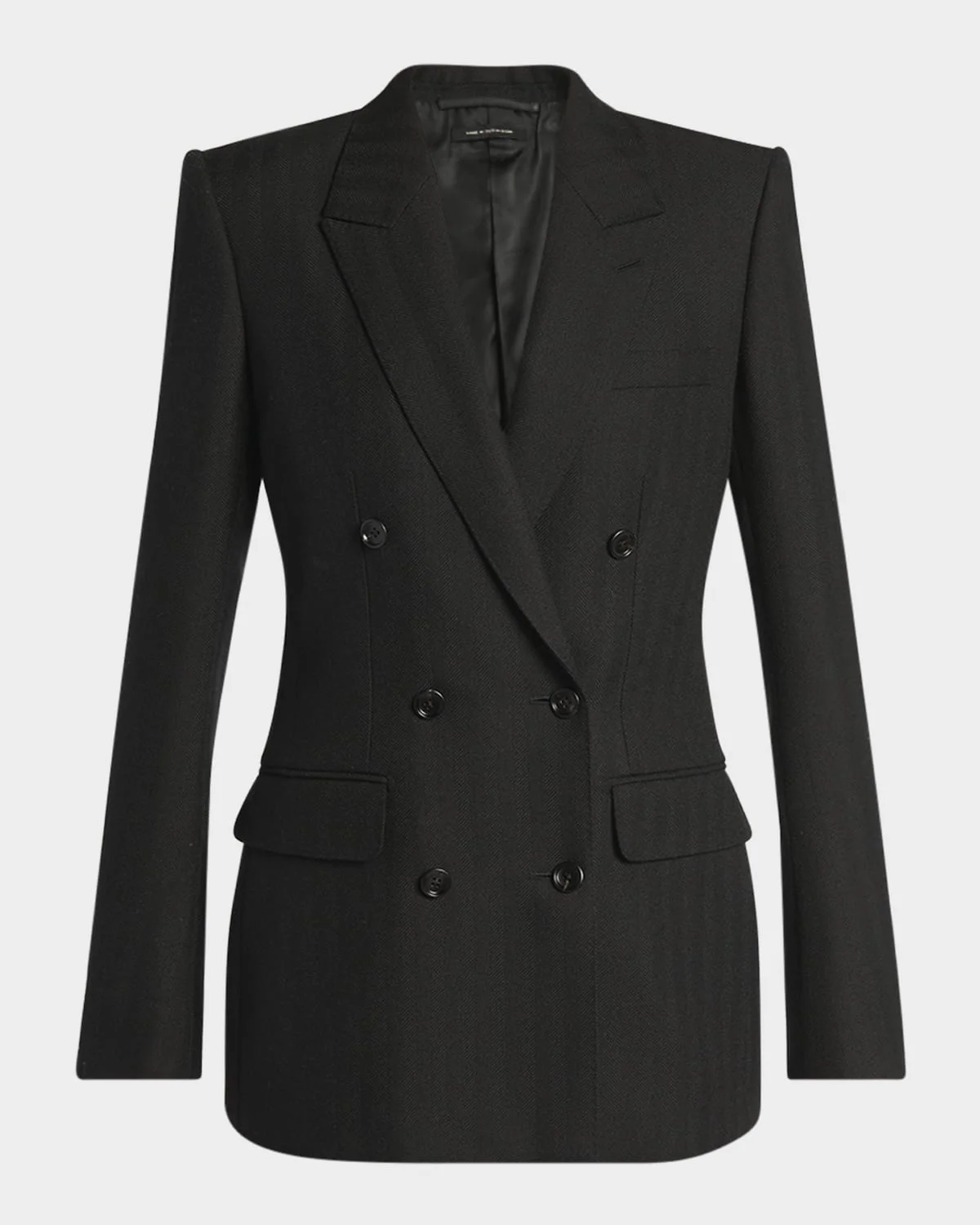 - TOM FORD blazer jacket tailored in a herringbone - Peak lapels; double-breasted front - Long sleeves; button cuffs - Padded shoulders - Chest welt pocket - Hip flap pockets - Slim fit - Hem falls below the hip - Walking vent back - Nylon/polyamide/elastane/silk - Made in Italy