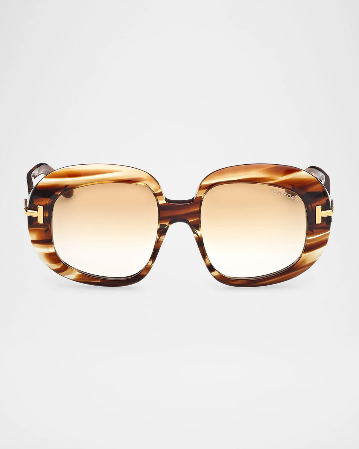 - The TOM FORD EYEWEAR ICON COLLECTION is the maximum expression of luxury. Inspired by personalities with charisma and presence, the collection shines the spotlight on unparalleled workmanship that elevates and enhances each element. Fine processing highlights these styles. Handcrafted Havana colorations and transparent acetate on the inner side of the temples with a new protective layer distinguish the tints of ICON sunglasses. The fine acetate frames are embellished with gold-tone metal inserts and engravings that create a surprisingly harmonious aesthetic. - Seductive thicknesses, volumes, and dimensions are characterized by 3D new logos with a shape that echoes the diamond’s baguette and becomes the new imprint of the brand. Each eye-catching frame with new high-quality ZEISS lenses transmits the strength, value, and personality of the brand through superb comfort, irresistible allure, and optimal vision. Designed to identify and inspire people who seek the true essence of elite style, the collection embodies the legendary quality and craftsmanship of TOM FORD EYEWEAR. - TOM FORD "Icon" round sunglasses in acetate - Lens/bridge/temple (in mm): 58-18-140 - Gradient lenses; logo on corner - Saddle nose bridge - Signature T hinges - Thin, tapered arms - 100% UVA/UVB protection - Made in Italy - Proposition 65 warning for California residents