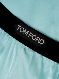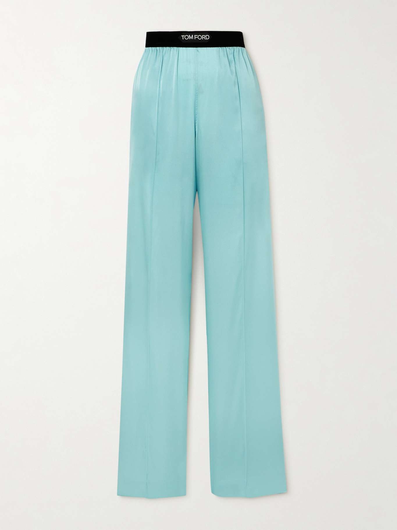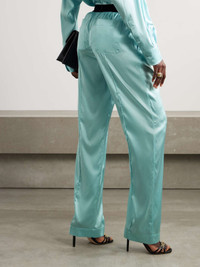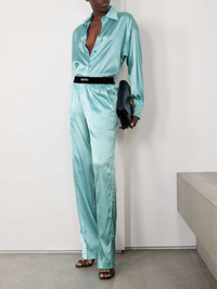 EDITORS'NOTES TOM FORD's pants might be modeled on pajamas, but they feel too glamorous to only wear around the house. They're cut from glossy stretch-silk satin with flowing wide legs and an elasticated waistband, which is jacquard-woven with the brand's logo. SIZE & FIT - Fits true to size, take your normal size - High-rise, designed for a wide-leg fit - Elasticated at the waist for a comfortable fit - Mid-weight, fluid, non-stretchy fabric - Model is 180cm/ 5'11" and is wearing a size Small DETAILS & CARE - Turquoise stretch-silk satin, black and white jacquard - Pull on - 94% silk, 6% elastane; trim: 90% polyamide, 10% elastane - Dry clean