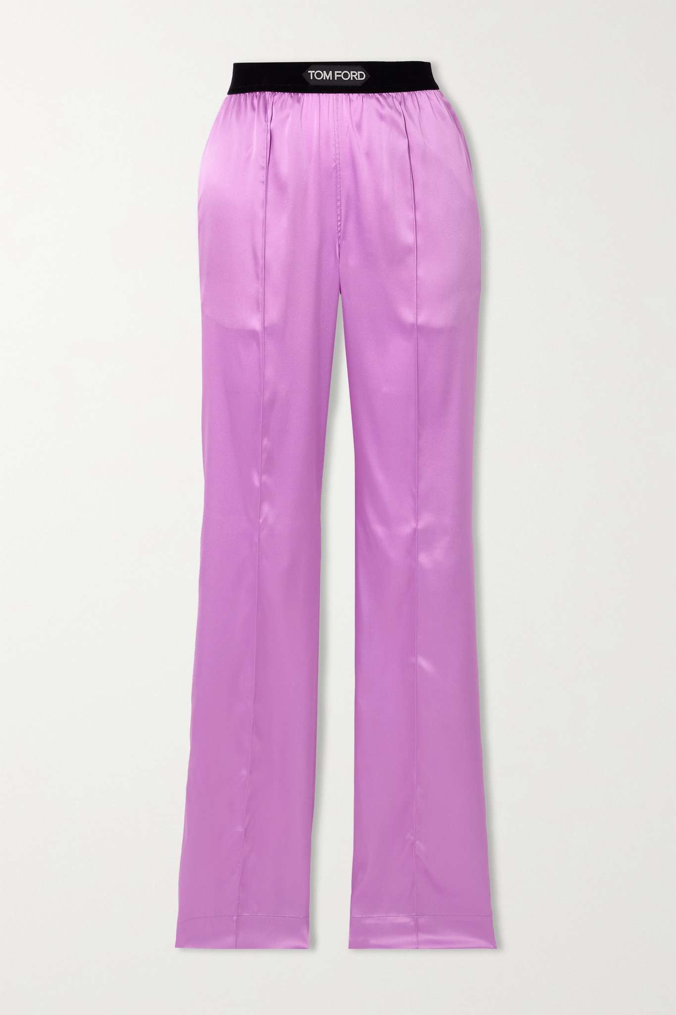 EDITORS'NOTES TOM FORD's pants might be modeled on pajamas, but they feel too glamorous to only wear around the house. They're cut from glossy stretch-silk satin with flowing wide legs and an elasticated waistband, which is jacquard-woven with the brand's logo. SIZE & FIT - Fits true to size, take your normal size - High-rise, designed for a wide-leg fit - Elasticated at the waist for a comfortable fit - Mid-weight, fluid, non-stretchy fabric - Model is 180cm/ 5'11" and is wearing a size Small DETAILS & CARE - Violet stretch-silk satin, black and white jacquard - Pull on - 94% silk, 6% elastane; trim: 90% polyamide, 10% elastane - Dry clean