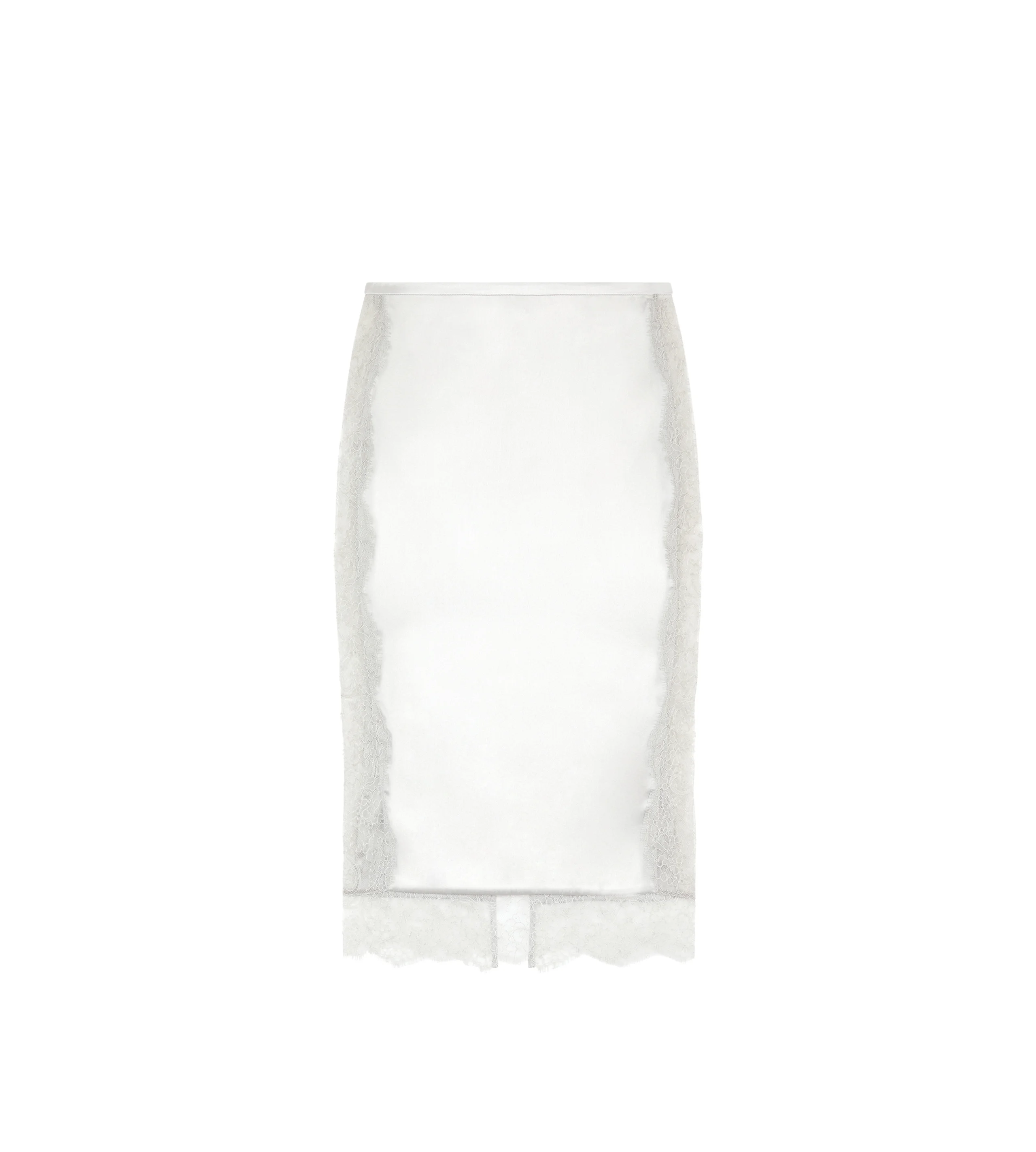 - KNEE-LENGTH SKIRT WITH LACE INSERTS - BOTTOM FINISHED WITH FINE CHANTILLY LACE FEATURING A REFINED PATTERN OUTLINED IN CORDONNET - CENTRE BACK SLIT - INVISIBLE ZIP AT THE CENTRE BACK - CRAFTED IN STRETCH CREPE SATIN - 93% SILK 7% ELASTANE
