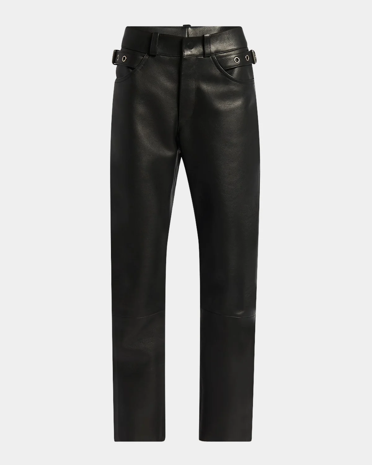 - TOM FORD biker pants in a supple bull leather adorned with dual buckle straps on the hips - Mid rise sits high on hip - Side slip pockets - Back zipper pockets - Straight legs - Full length - Snap front/zip fly; belt loops - Leather - Made in Italy