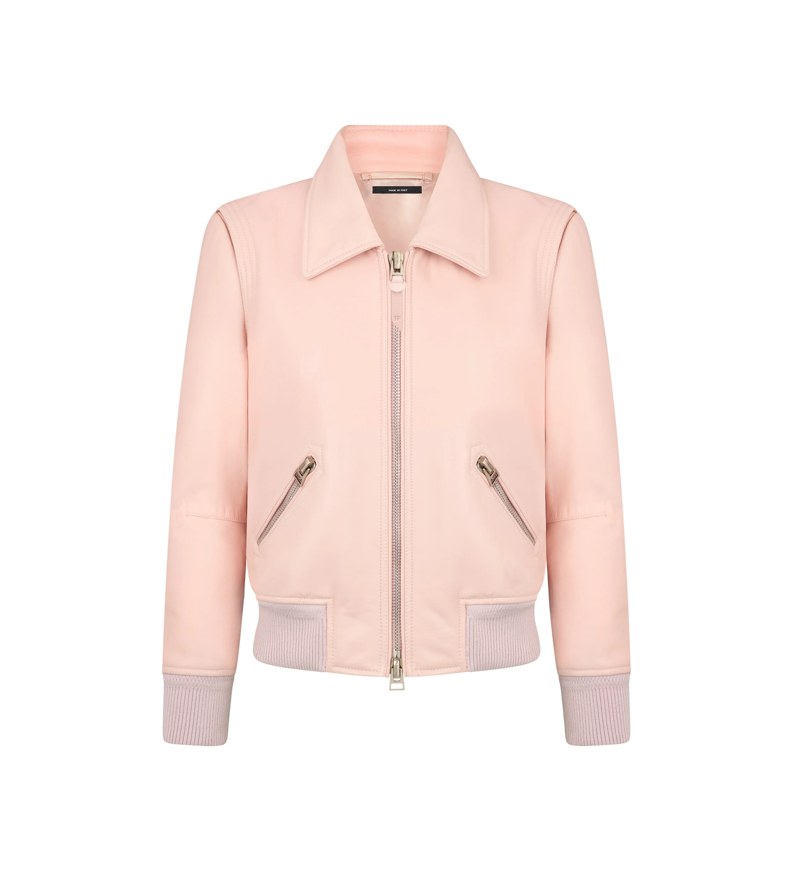 - LEATHER COLLAR BLOUSON - RELAXED FIT - FRONT SLANTED ZIPPER POCKETS - COLLAR WITH STUD FASTENING - DOUBLE ENDED SIGNATURE ZIP CLOSURE - LEATHER ZIP PULLER WITH EMBOSSED TF LOGO - KNITTED RIB TRIMS ALONG WAIST AND CUFFS - BLACK AND PALLADIUM TRIMS - TOM FORD SIGNATURE LEATHER GRAB HANDLE - FULLY LINED - CRAFTED IN NAPPA GRAIN LEATHER - 100% LAMB LEATHER - MADE IN ITALY