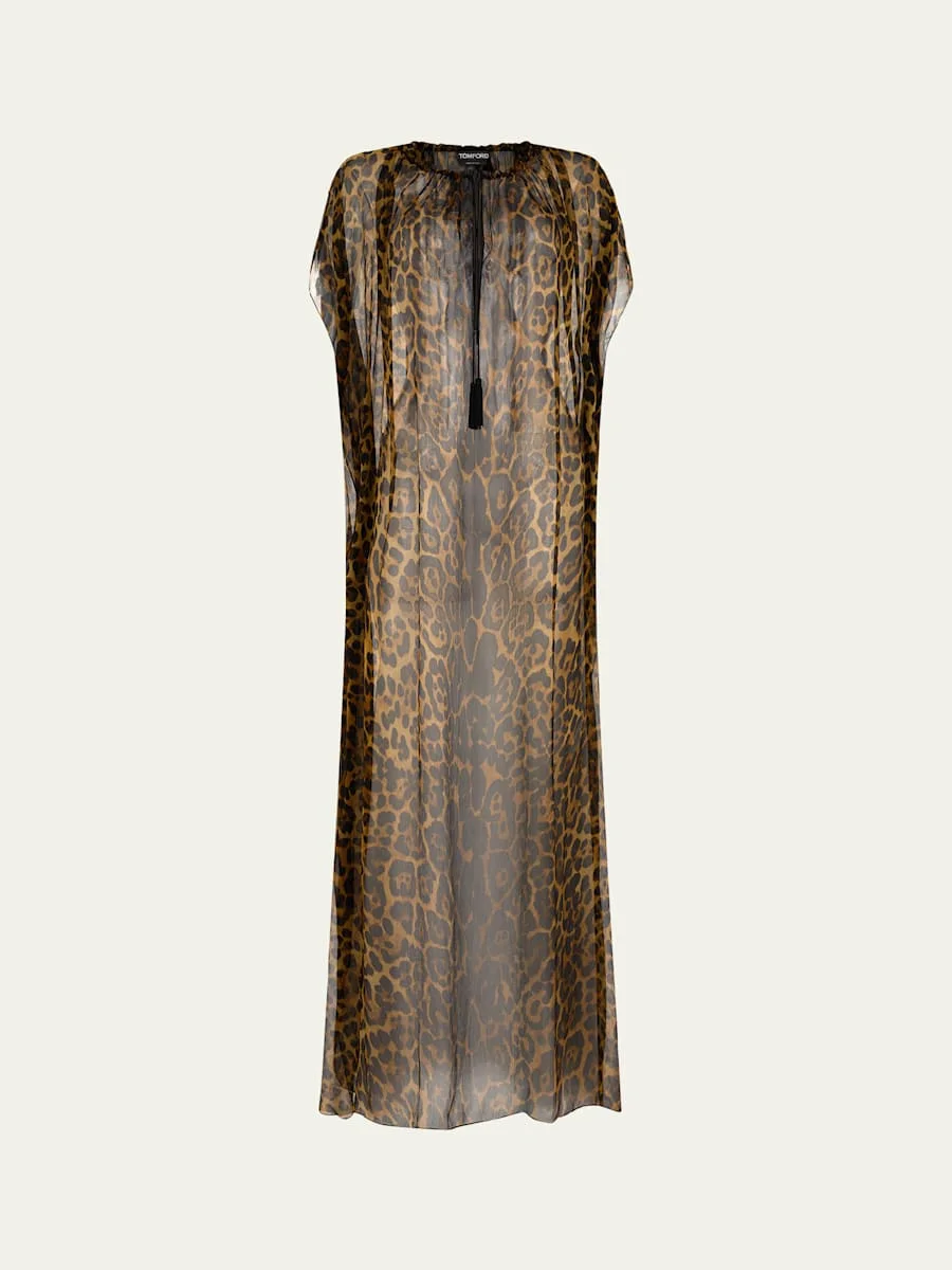 TOM FORD sheer kaftan in leopard print Round neckline Cap sleeves Loose silhouette Full length Slipover style Silk/acetate Made in Italy
