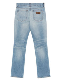 logo-patch tapered jeans Highlights - Cerulean blue - Concealed fly and button fastening - Belt loops - Classic five pockets - Whiskering effect Made in United States Composition Cotton 98%, Polyurethane 2%