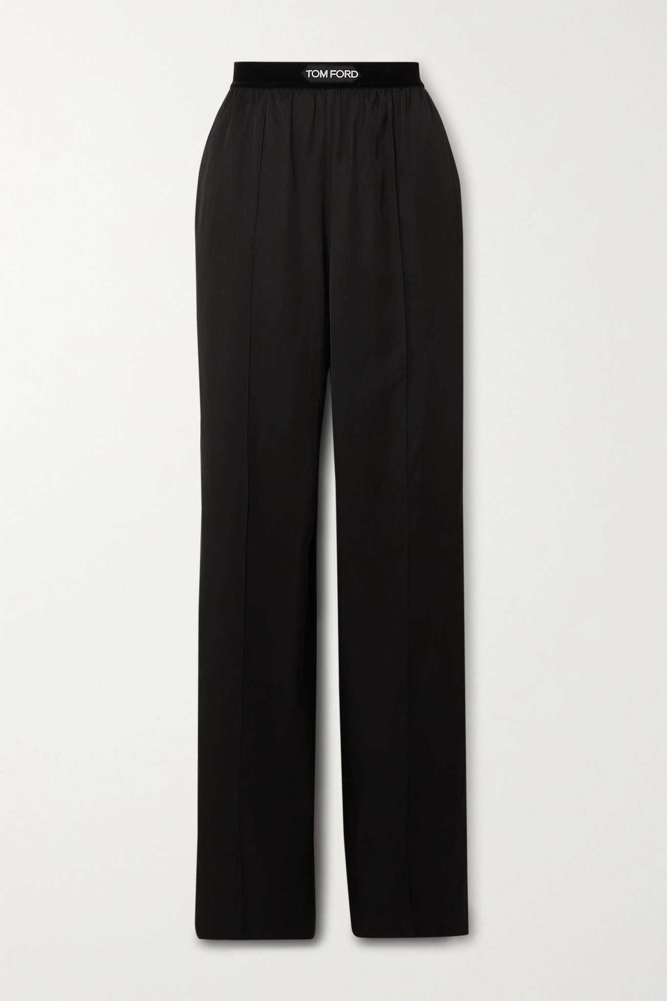 EDITORS'NOTES Expertly tailored in Italy, TOM FORD's pajama-style pants are suitable for nice dinners and daytime looks alike. They're made from lustrous satin and have an elasticated, logo-detailed velvet waistband. Balance the relaxed legs with heeled sandals. SIZE & FIT - Fits true to size, take your normal size - High-rise, cut for a relaxed fit - Elasticated at the waist for a comfortable fit - Lightweight, stretchy fabric - Model is 177cm/ 5’10” and is wearing a size Small DETAILS & CARE - Black satin and velvet - Pull on - 100% viscose - Dry clean