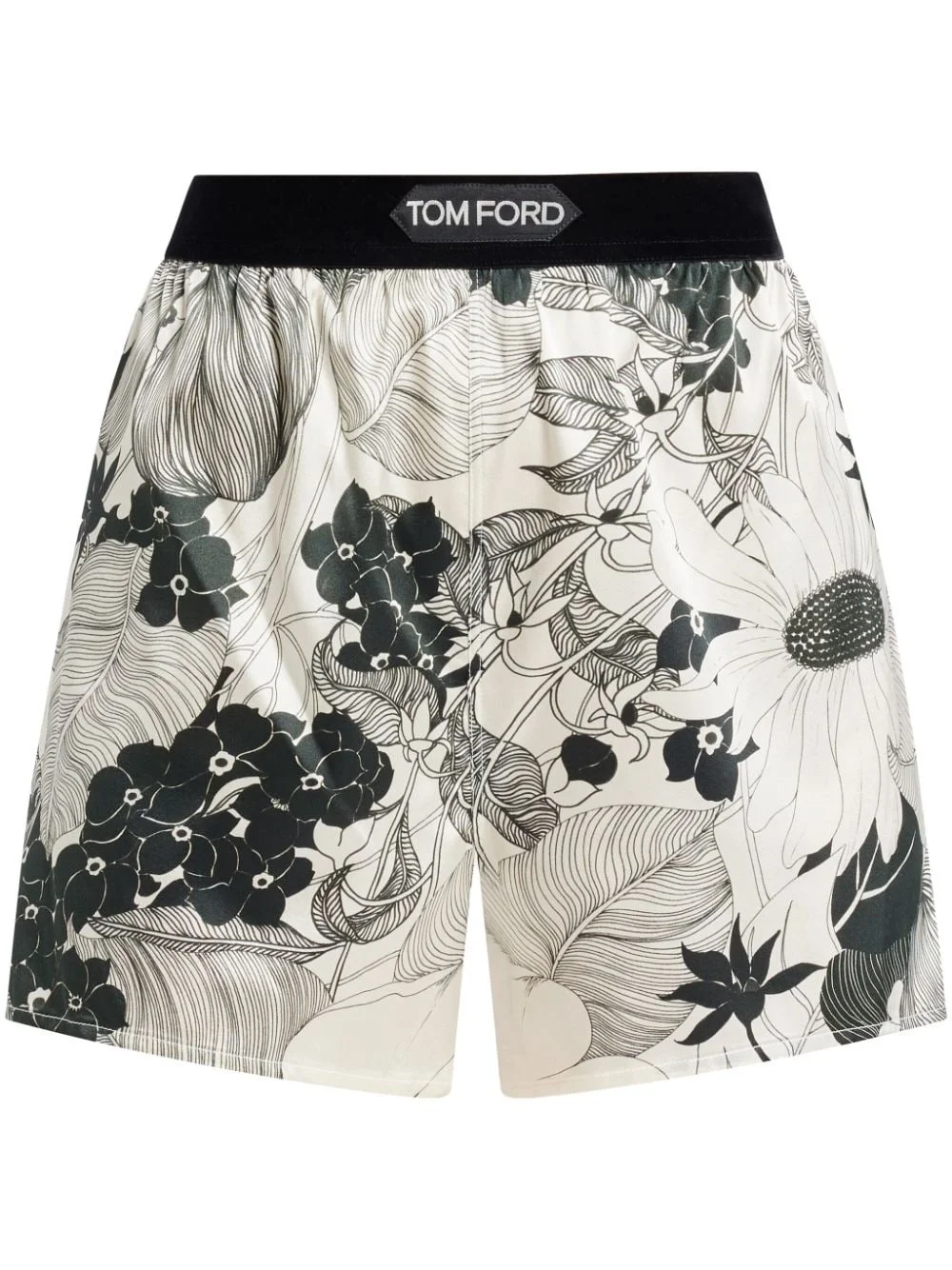 logo-waistband floral-print shorts Highlights - White/black - Silk blend - Logo waistband - Floral print - Straight hem Made in Italy Composition Silk 94%, Elastane 6%