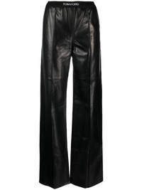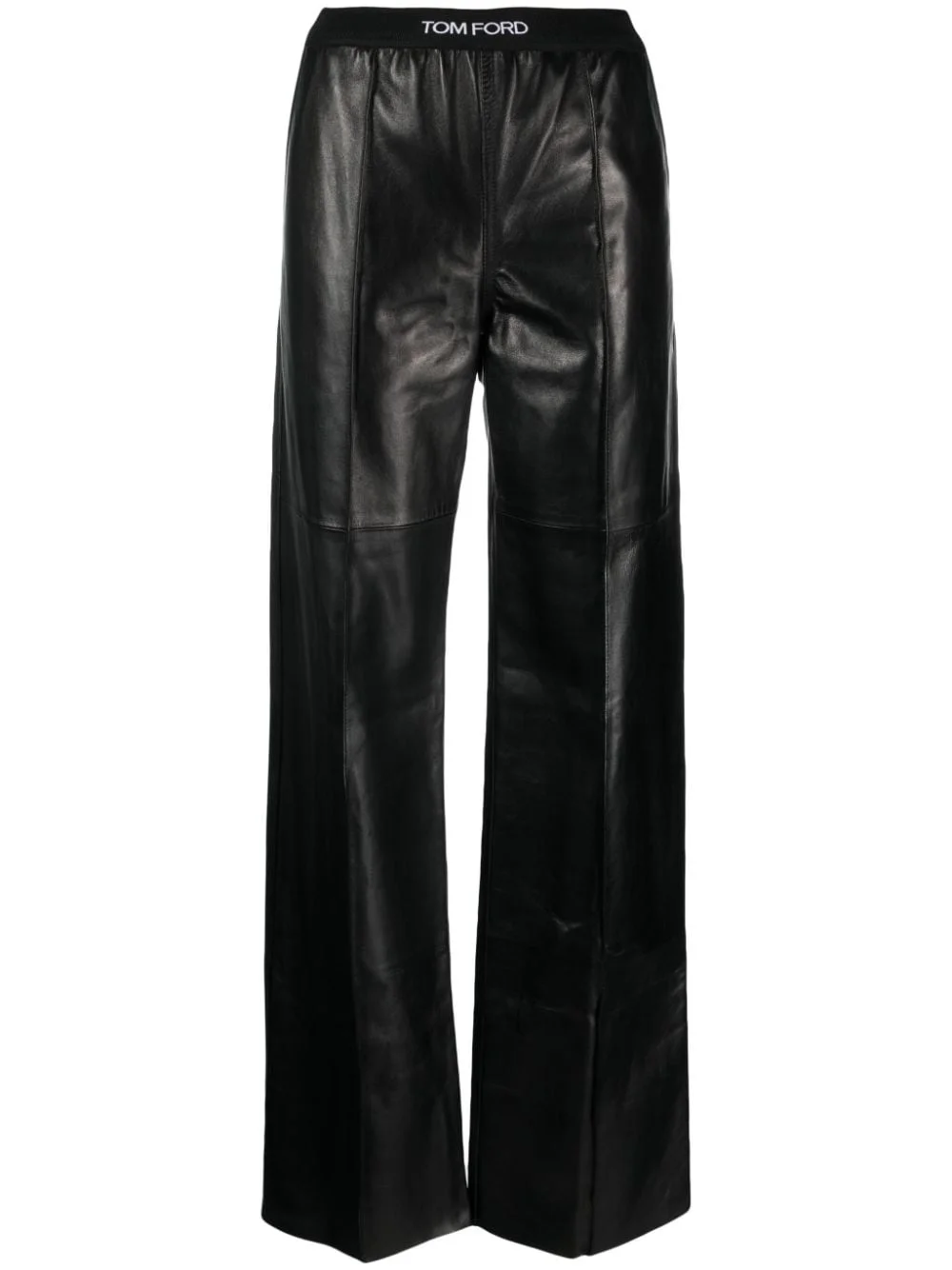 logo-waistband leather trousers These trousers showcase TOM FORD’s ability to infuse sleek designs with a rebellious edge. They’re crafted in black leather to fit straight through the leg and are finished with a logo waistband. Highlights - Black - Leather - Logo waistband - Two side slit pockets - Two rear patch pockets - Straight leg Made in Italy Composition Lining: Silk 92%, Elastane 8% Outer: Leather 100% Washing instructions Specialist Cleaning