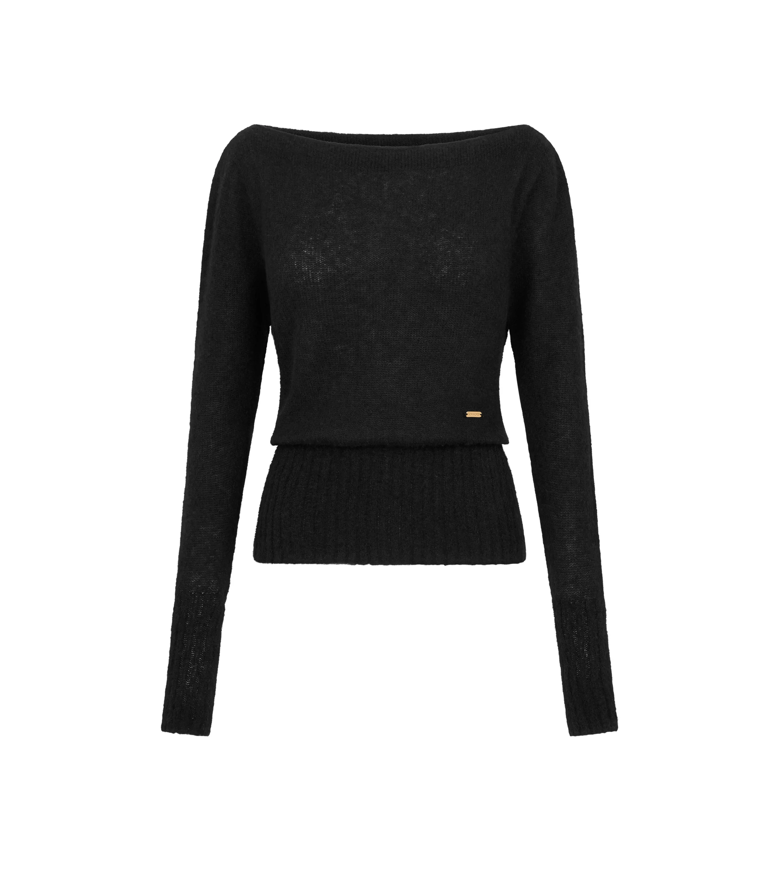 - LONG SLEEVE BOAT NECK KNIT - TOM FORD METAL PLAQUE - RIBBED CUFFS AND BASQUE - CRAFTED IN WHOLE GARMENT CASHMERE SILK - 6 GAUGE - 74% CASHMERE 26% SILK