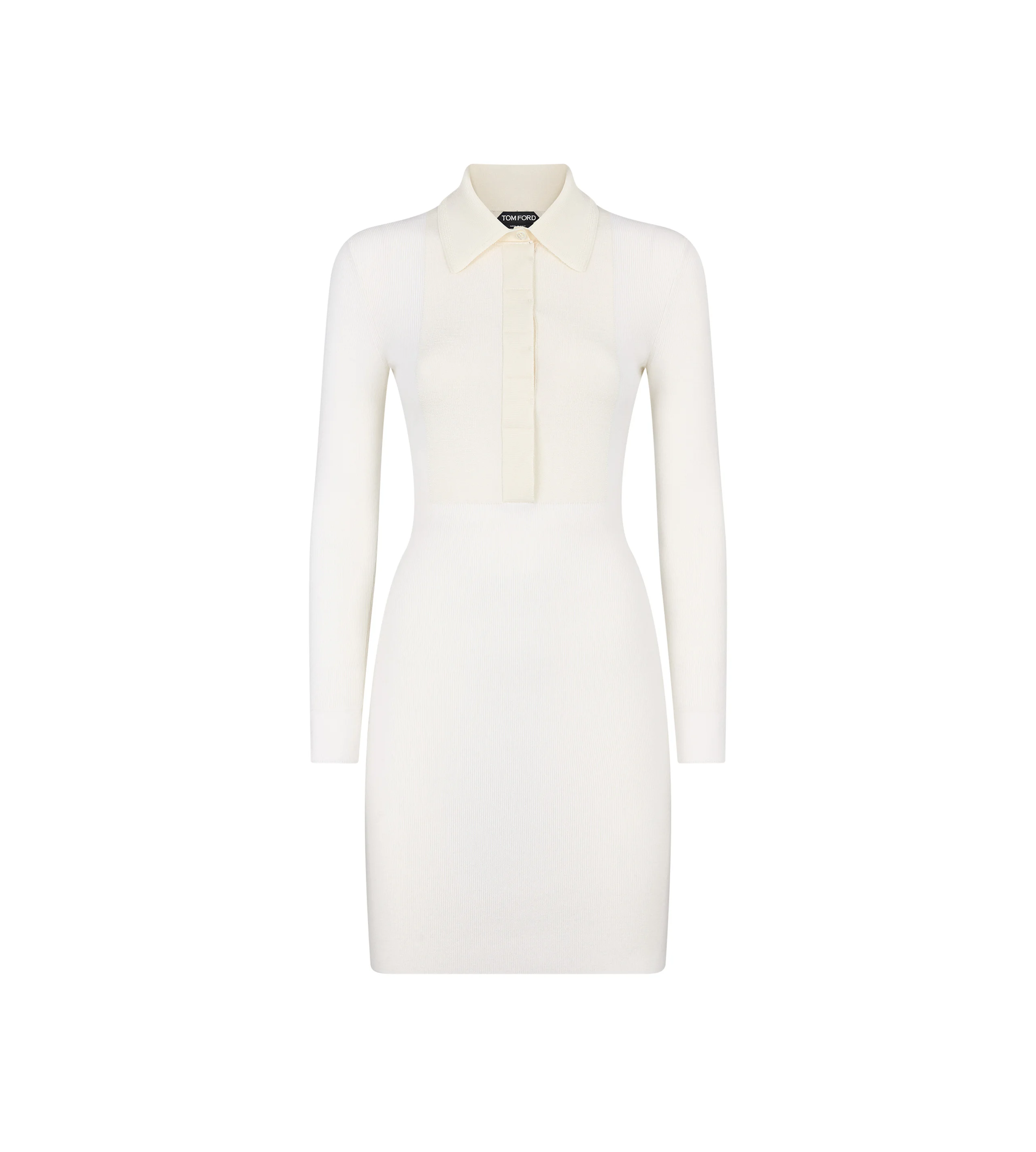 - LONG SLEEVE PLASTRON POLO MINI DRESS - COVERED DEEP BUTTON PLACKET - MOTHER OF PEARL BUTTONS - CRAFTED IN FINE STRETCH MERINO WOOL - GAUGE 14 - 76% VIRGIN WOOL 12% VISCOSE 9% POLYESTER 2% NYLON 1% POLYURETHANE