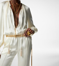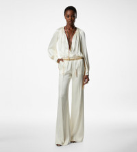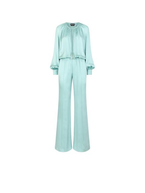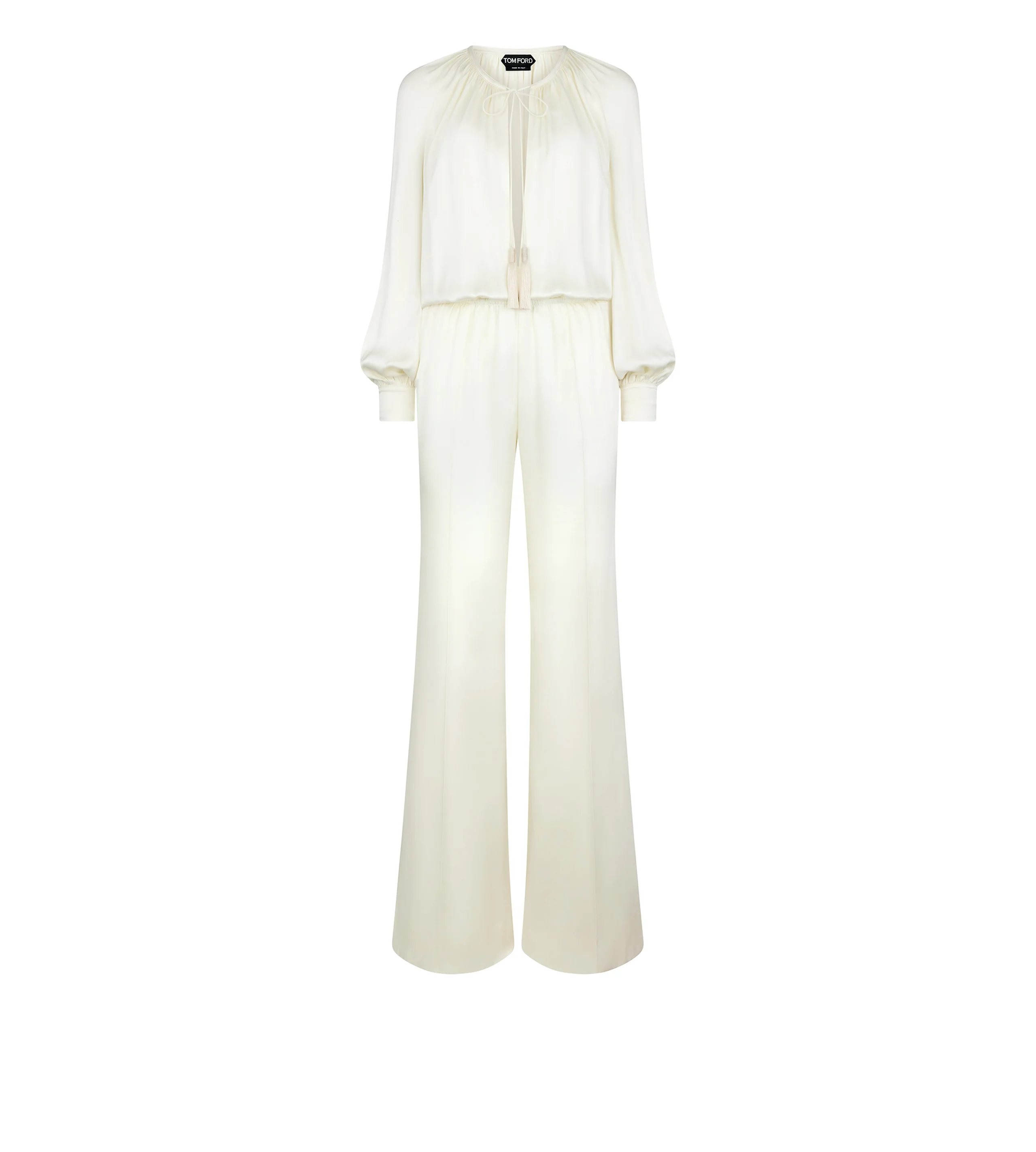 - LONG SLEEVE GATHERED JUMPSUIT - RAGLAN SLEEVE - FLARE PANT FIT - SLANTED SIDE POCKET - ELASTICATED WAIST - DEEP SOFT GATHERED NECKLINE - GATHERED CUFFS WITH COVERED BUTTONS - DRAWSTRINGS WITH TASSEL AT NECK FOR CLOSURE - LINING: 100% SILK - CRAFTED IN FLUID DOUBLE SILK SATIN - 100% SILK