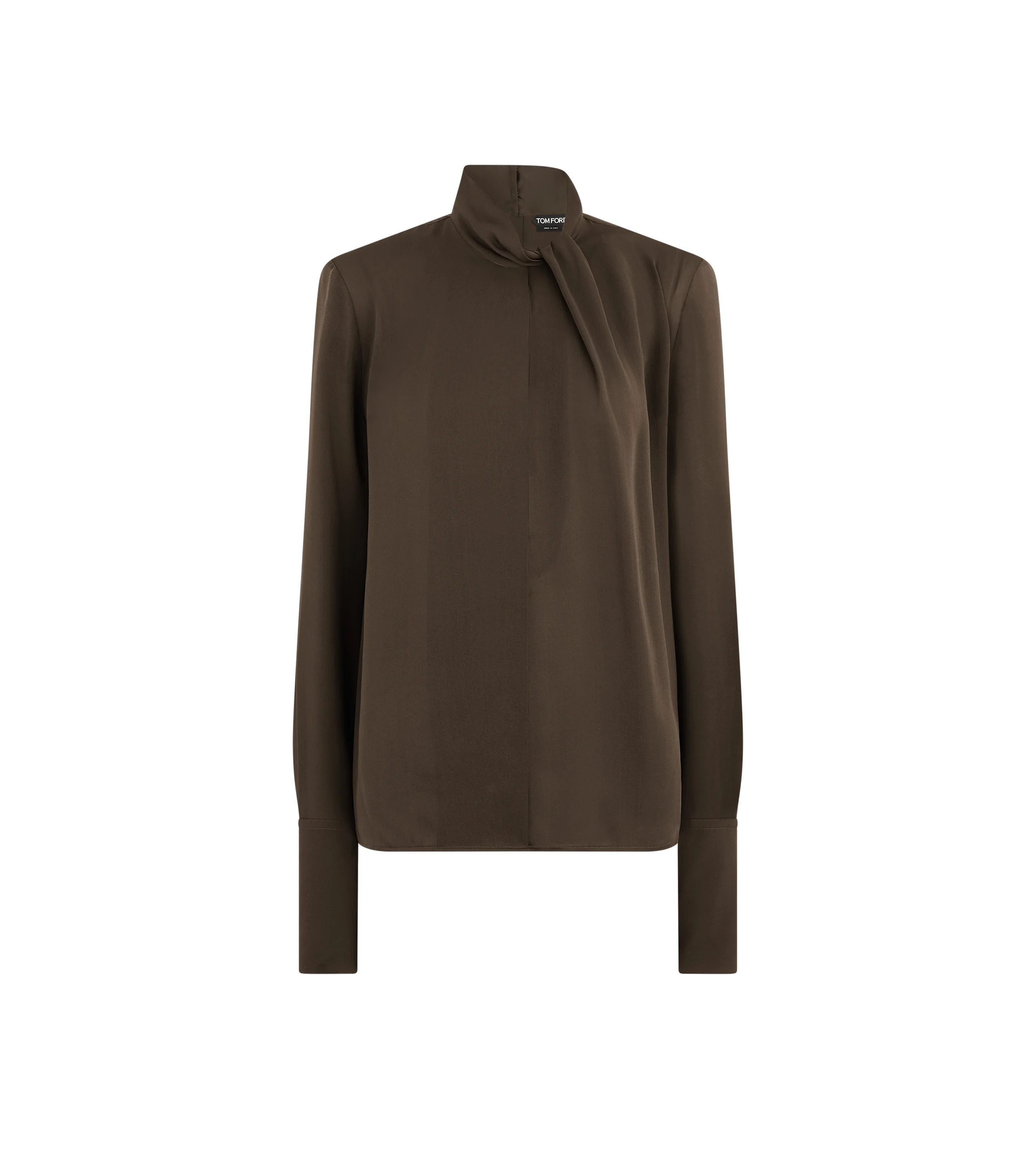 - LONG SLEEVE DRAPED COLLAR BLOUSE WITH CUT-OUT - DEEP KNIFE PLEAT AT CENTRE FRONT - KISSING PLEAT DETAIL AT CENTRE BACK - CONCEALED HOOK AND EYE CLOSURE AT CENTRE BACK COLLAR - SELF COVERED BUTTONS ON CUFFS - CRAFTED IN WASHED SILK GEORGETTE - 100% SILK