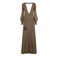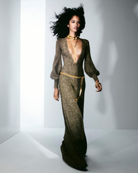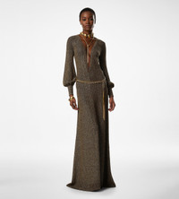 - LONG V-NECK DRESS - OPEN BACK - BISHOP SLEEVE - RIBBED NECKLINE AND CUFFS - SELF BELT WITH TASSELS - TOM FORD LOGO METAL PLAQUE AT THE BACK - CRAFTED IN VANISE' VISCOSE LUREX RIB - 14 GAUGE - 67% VISCOSE 15% METALLIC POLYESTER 16% POLYAMIDE 2% POLYURETHANE - MADE IN ITALY