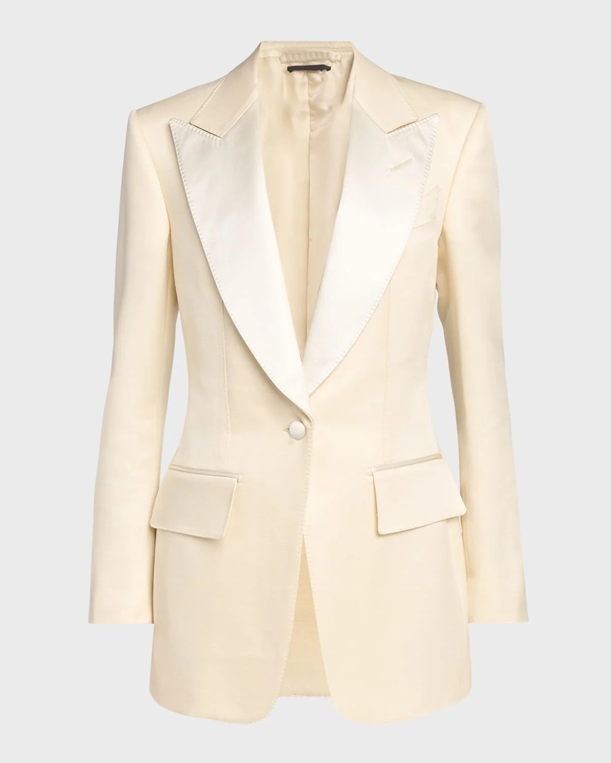 TOM FORD lustrous barathea tuxedo jacket fetauring satin lapels and topstitching Peak lapels; single-breasted front Long sleeves; button cuffs Padded shoulders Chest welt pocket; side flap pockets Slim fit Center-back vented hem Wool/silk Made in Italy Model is 5 & apos;10"/177cm.