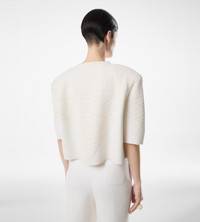 PRODUCT NO: MAK1412-YAX947 This architectural crewneck T-shirt redefines knitwear through structure and surface. The square fit is framed by short sleeves and self fabric covered shoulder pads, creating a silhouette with a relaxed edge. Compact merino cashmere interlock, elevated with silk chenille embossed in a python motif. The effect recalls the sensuality of TOM FORD exotic leather, translated into a tactile, wearable texture that merges softness with strength. Composition: 45% silk, 41% wool, 10% cashmere, 2% polyamide, 2% elastane Made in Italy