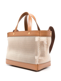 mesh-panelled shopping bag Highlights - Champagne/camel brown - Calf leather - Mesh panelling - Logo patch to the front - Two flat top handles - Detachable shoulder strap - Magnetic fastening - Main compartment Made in Italy Composition Outer: Polyester 100%, Calf Leather 100%, Brass 100% SIZE & FIT Model measurements Height 5 ft 11 in(1.8 m) Bust/Chest 31.49 in(80 cm) Hips 35.82 in(91 cm) Waist 24.8 in(63 cm) Measurement DEPTH 5.11 in(13 cm) HANDLE 5.11 in(13 cm) HEIGHT 7.87 in(20 cm) STRAP 16.53 in(42 cm) WIDTH 9.44 in(24 cm)