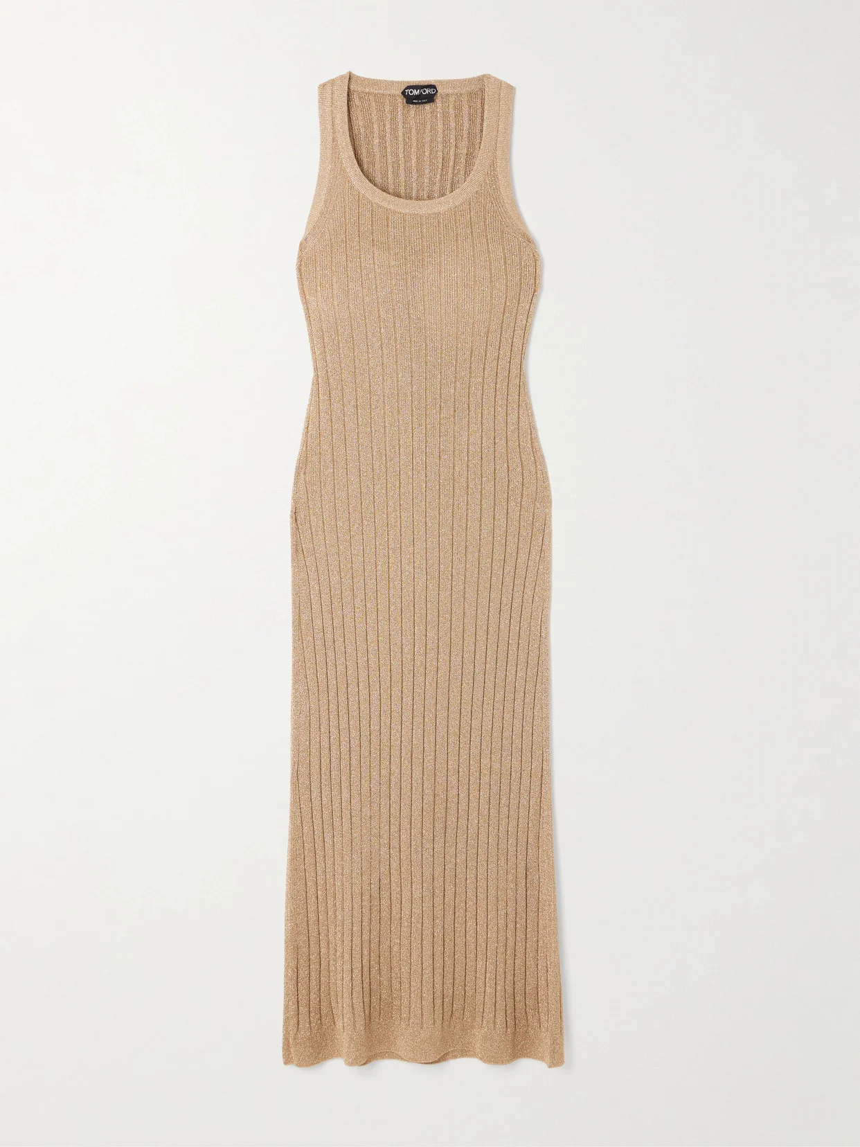 TOM FORD's dress is made from flexible ribbed-knit flecked with light-catching metallic threads. It's designed for a figure-hugging fit and has racerback straps. Wear it with a pair of the label's heels.