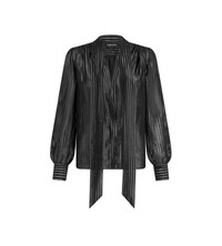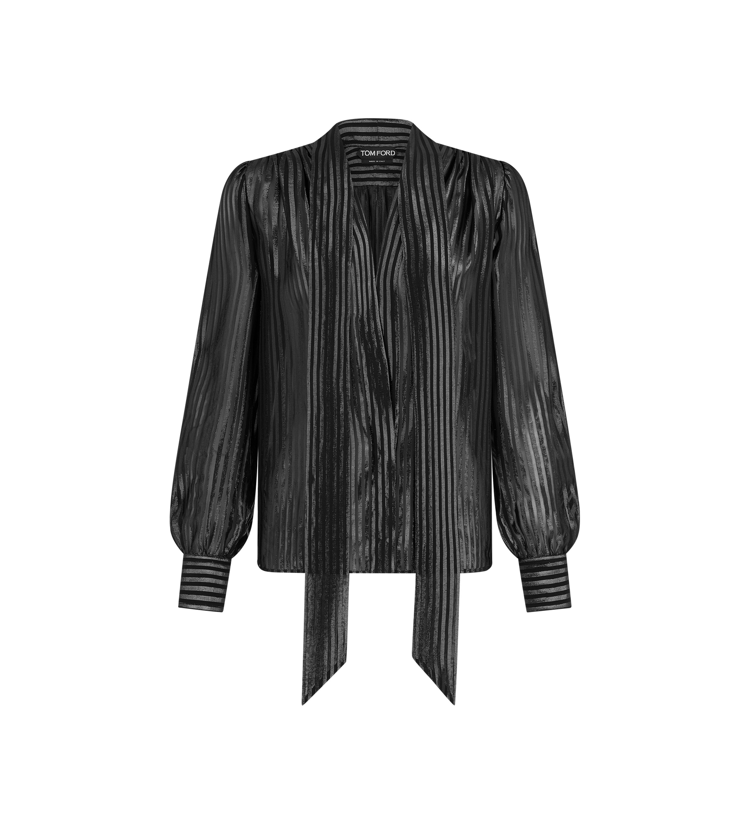 - LONG SLEEVE V-NECK LAVALLIERE BLOUSE - LONG NECK TIE - SLIGHTLY GATHERED ON THE SHOULDER AND SLEEVE - GATHERED BACK YOKE - MOTHER OF PEARL BUTTONS ALONG FRONT PLACKET - METAL HOOK AND EYE CLOSURE AT THE NECKLINE - COVERED BUTTONS ON THE CUFFS - CRAFTED IN LUREX STRIPED SILK - 79% SILK 21% METALLIC POLYESTER