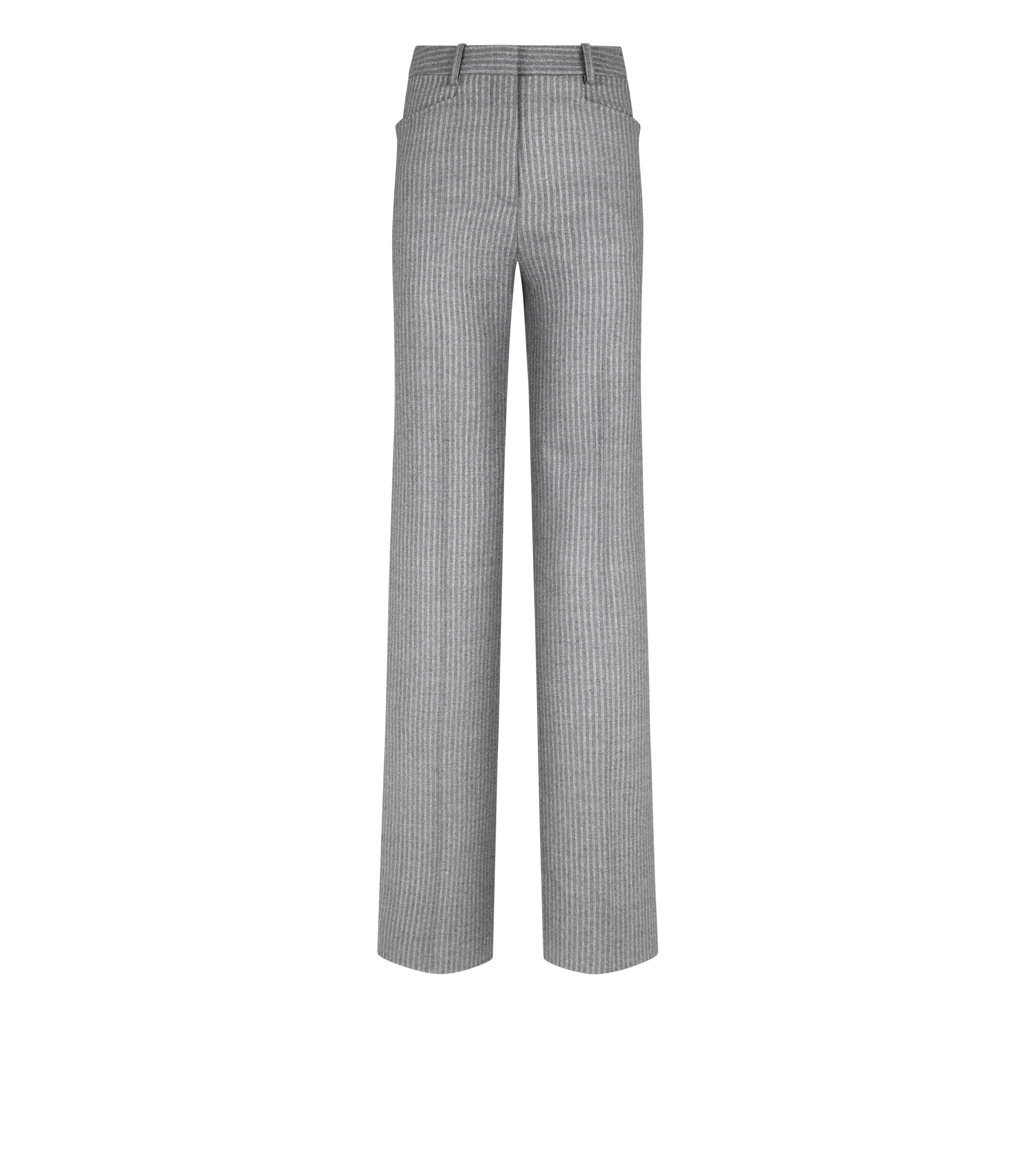 - BOOT CUT TAILORED PANTS - SIGNATURE TAILORING CONSTRUCTION - LOOPED WAISTBAND WITH HOOK AND BAR CLOSURE - FRONT FROGMOUTH POCKETS - WELT POCKETS ON THE BACK - SIGNATURE TOM FORD HORN BUTTON - SIGNATURE TOM FORD MOTHER OF PEARL BUTTONS - CRAFTED IN LUREX STRIPED WOOL FLANNEL - 91% VIRGIN WOOL 9% METALIZED POLYESTER